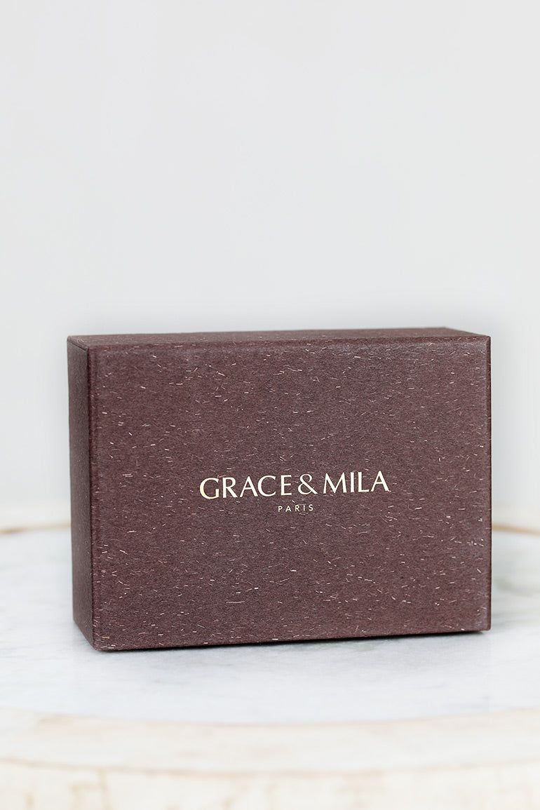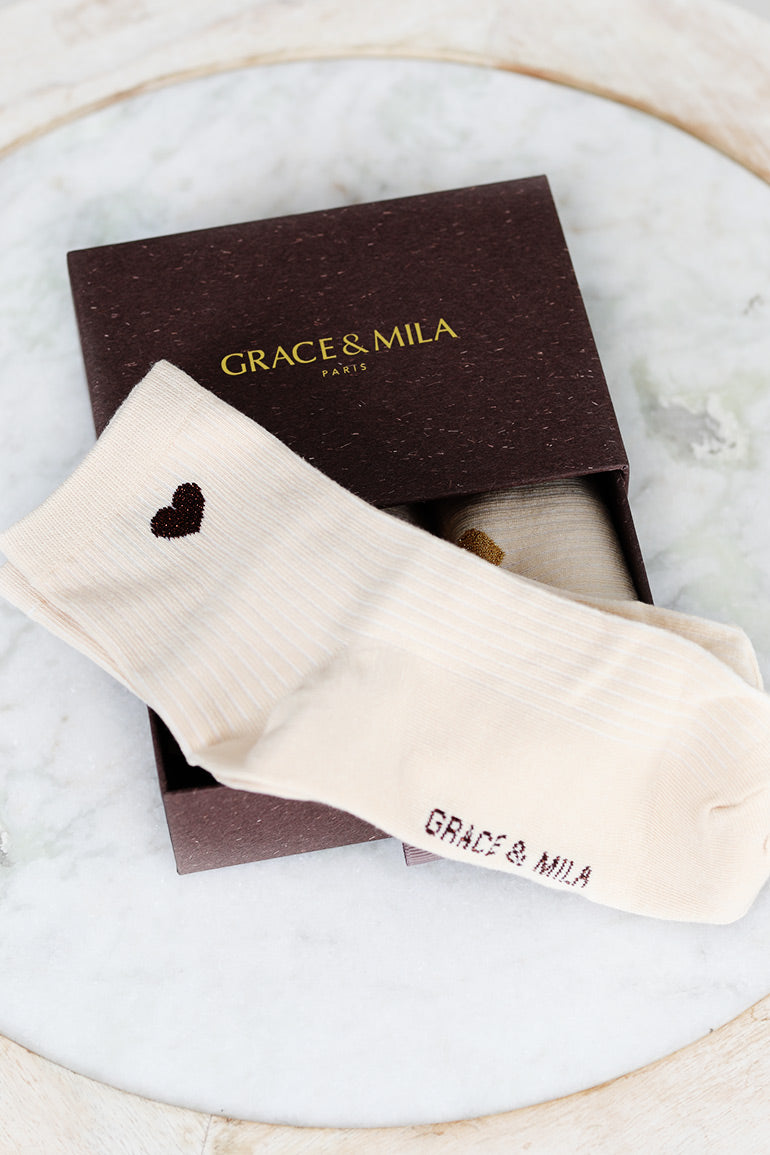Skjønn gaveeske fra franske Grace & Mila med tre fine sokkepar med gull hjerter. One size, men passer nok best fra 36-39.