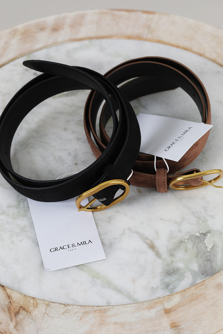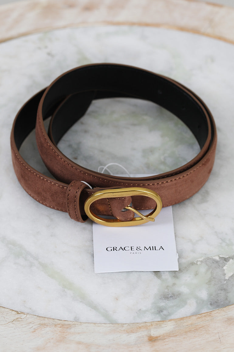 Nydelig belte fra franske Grace & Mila i semsket skinn med gullspenne.