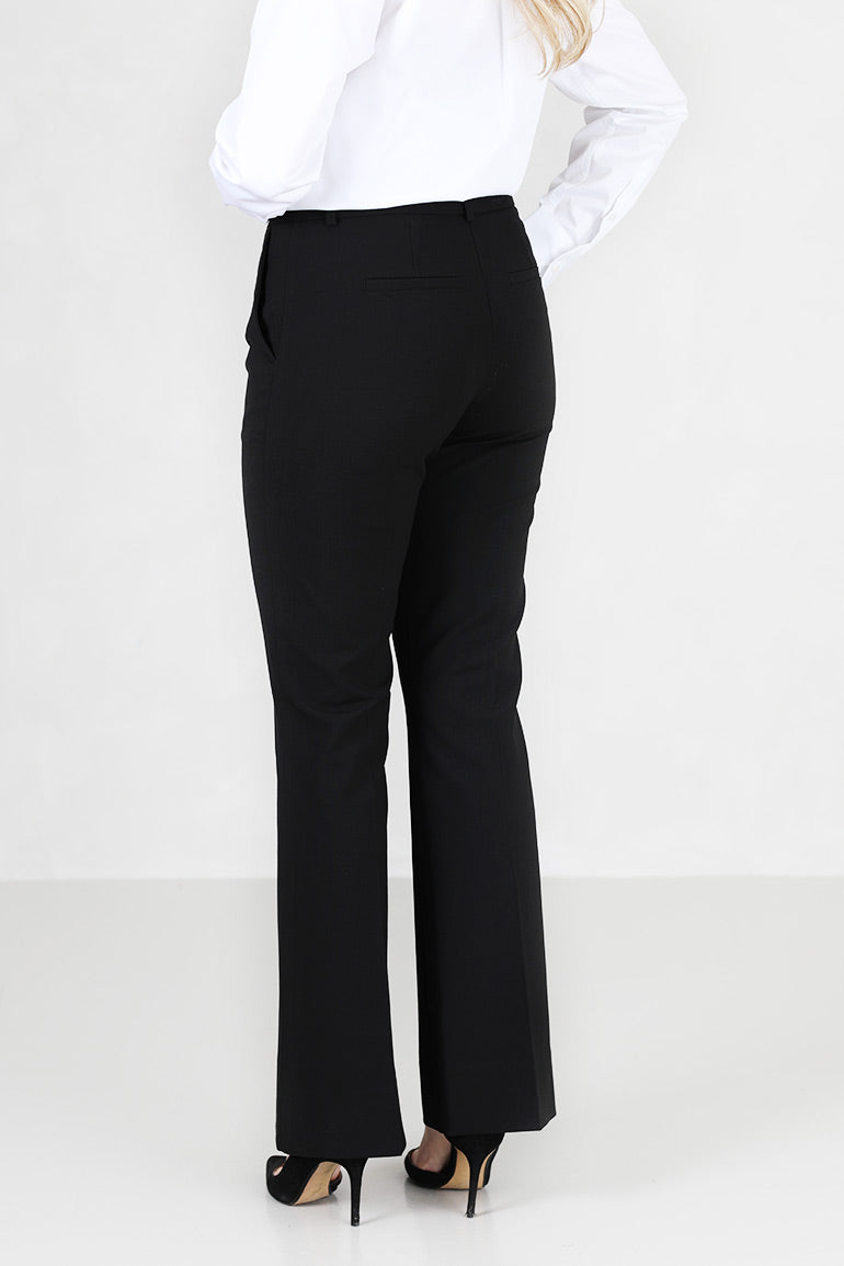 Ellers er modellen den samme - med en liten utsving i bena, smal i lårene medium høyt liv og stikk lommer i sidene. Lukkes med glidelås og hempe foran.