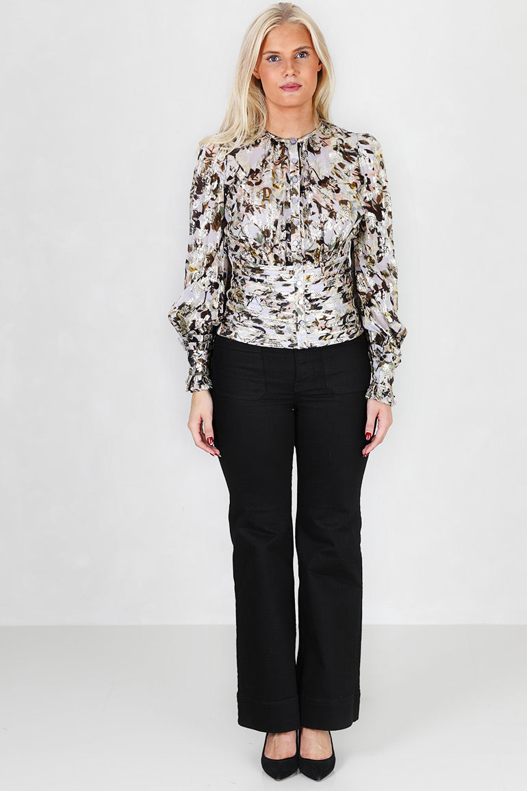 Nydelig bluse fra byTiMo i et pent mønster med gulutråder. Strikk i livet bak, så den sitter perfekt i midjen. Lange ermer, rund hals og knapper i halsen.