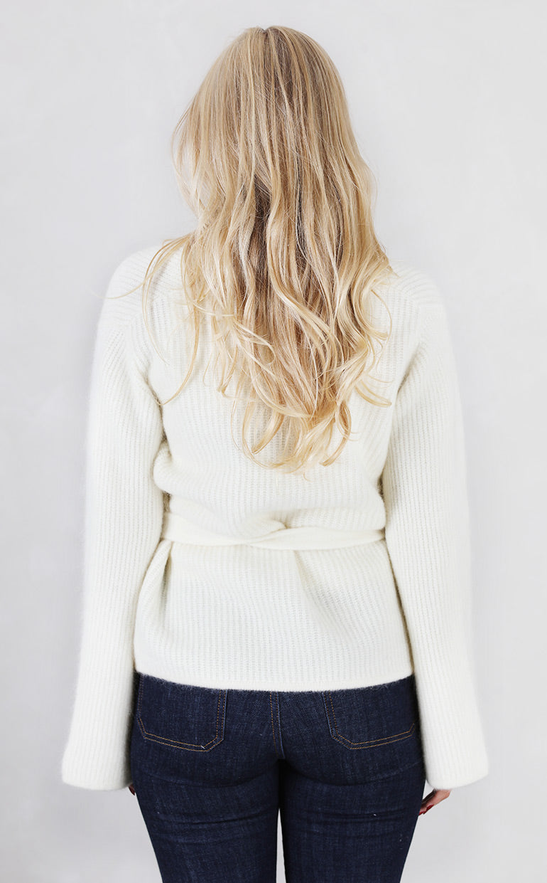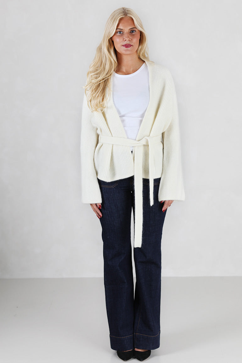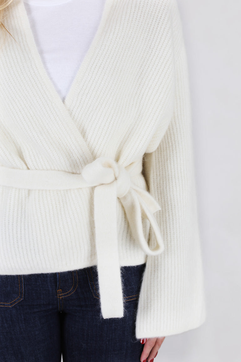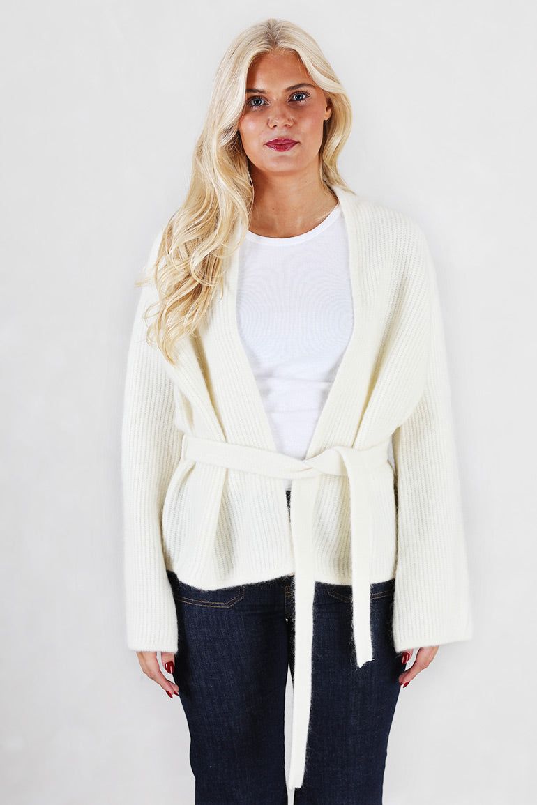 Nydelig strikk fra norske Christian Aks. Wrap cardigan med lange ermer og løst belte i livet. Pen ribbestrikk.