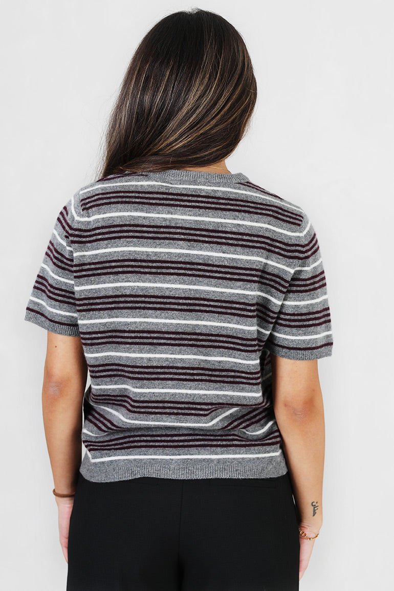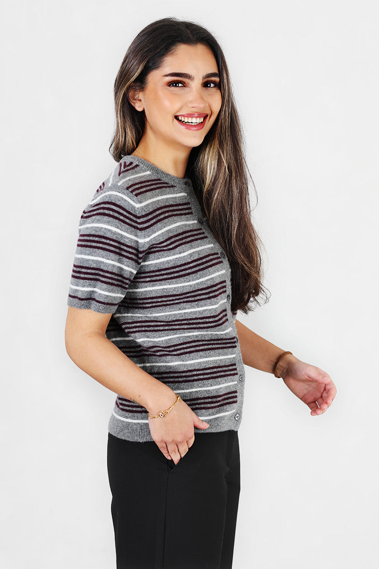 Skjønn cardigan med korte ermer fra norske Arnie Says. Rund hals, knapper helt ned. Grå, burgunder, hvite striper.