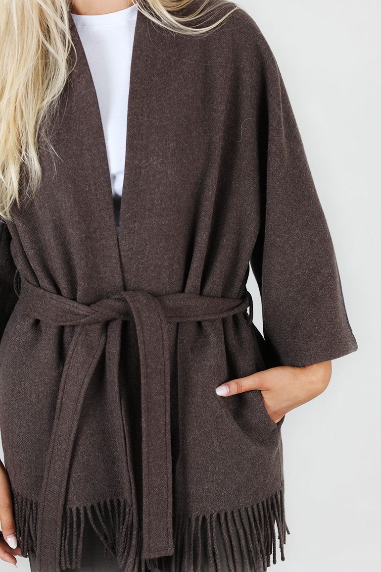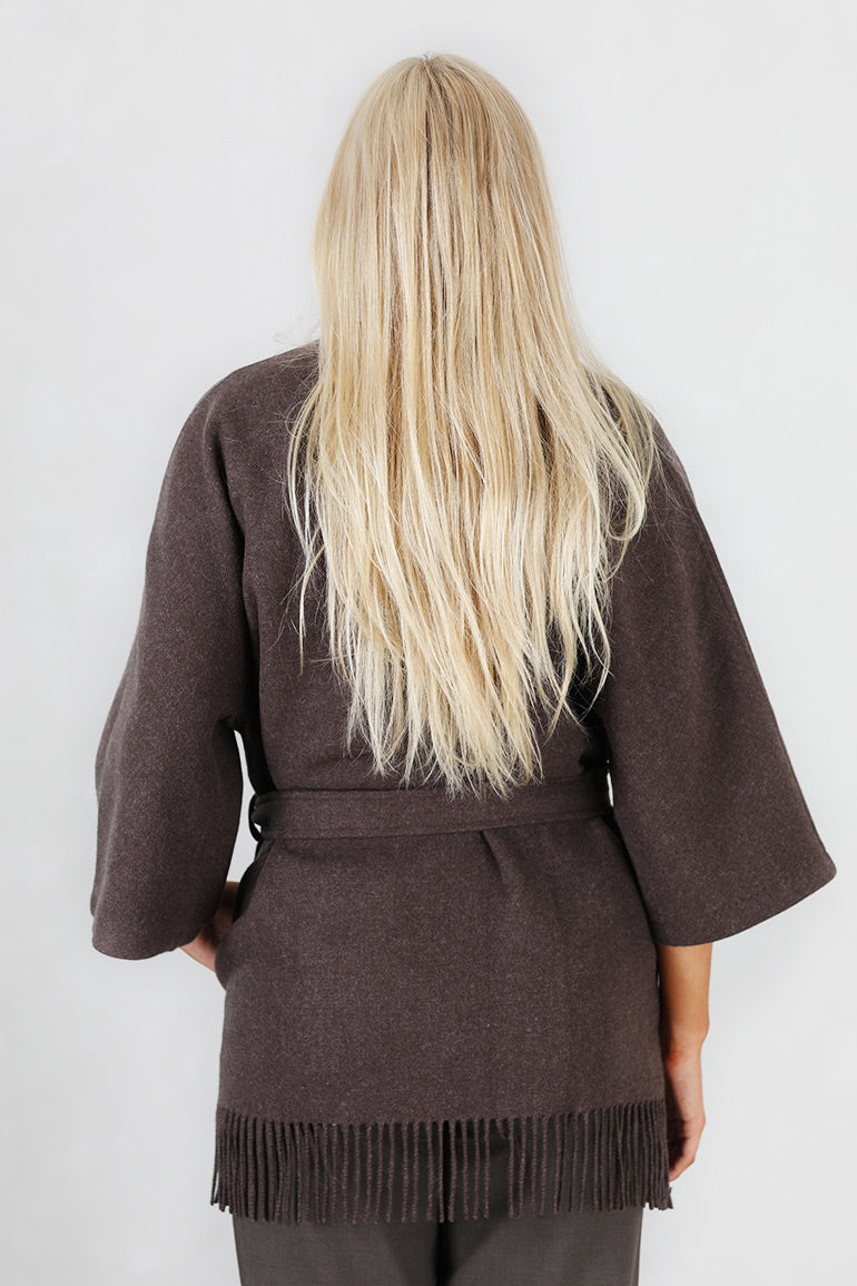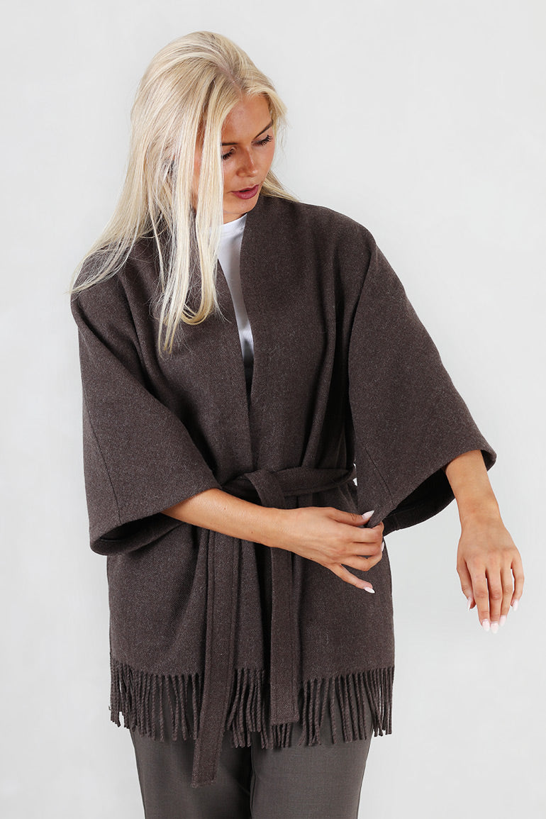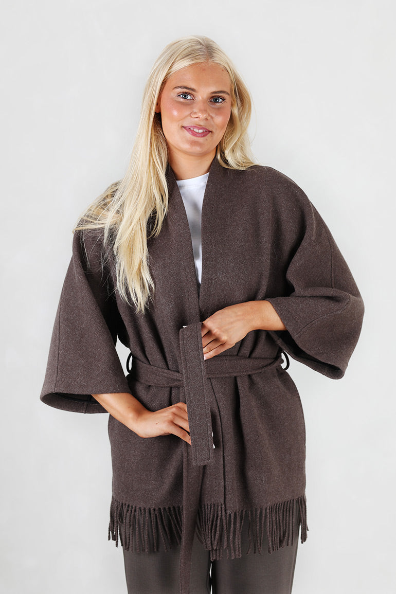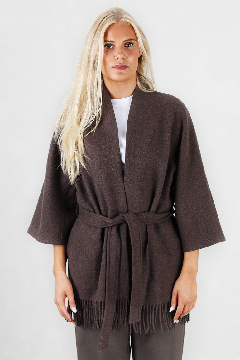 Signarurjakken til Christian Aks i denne fantastiske sjokoladebrune fargen for høsten! Lommer i sidene, løst knytebelte i livet og frynsekant nederst. Romslig modell.