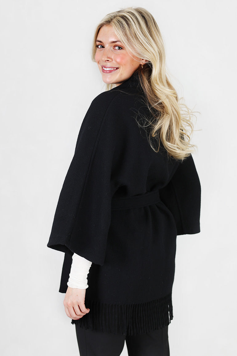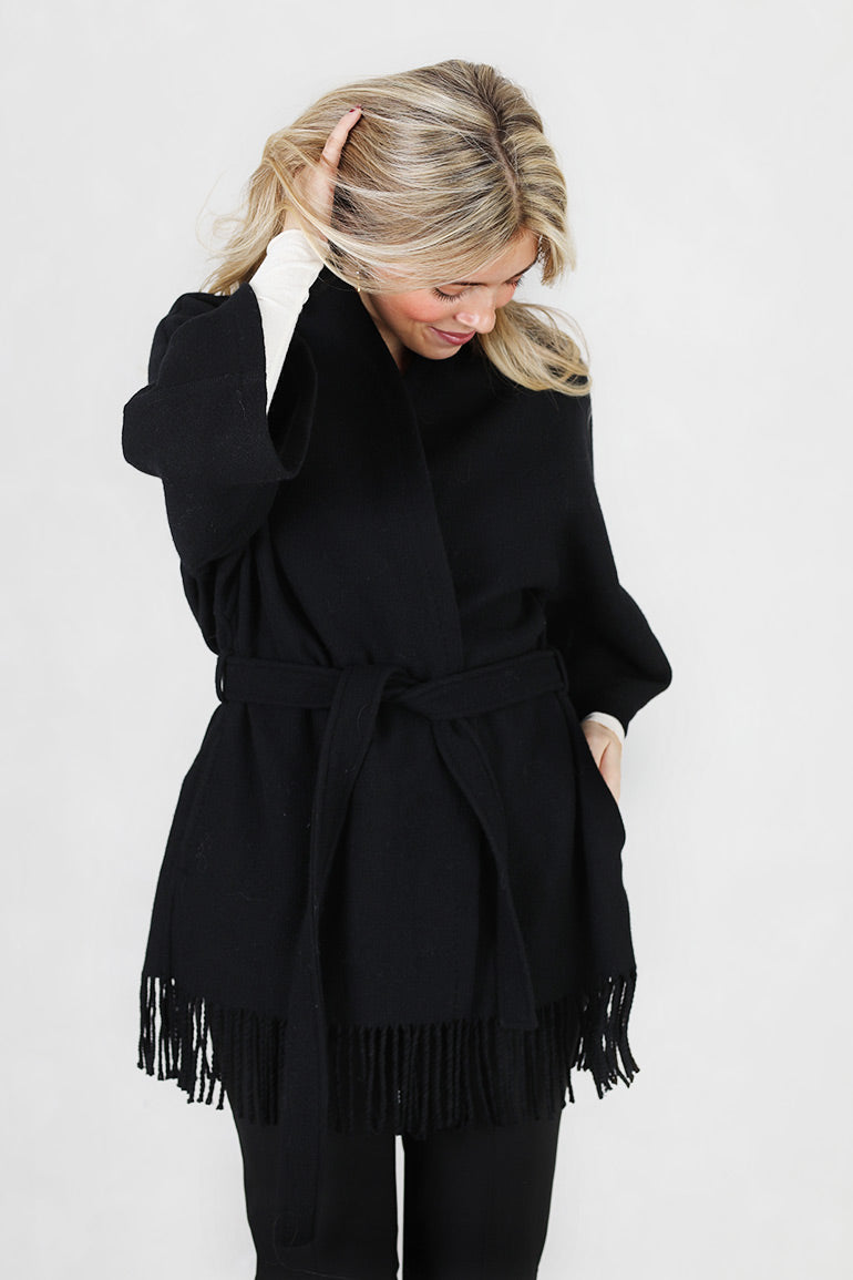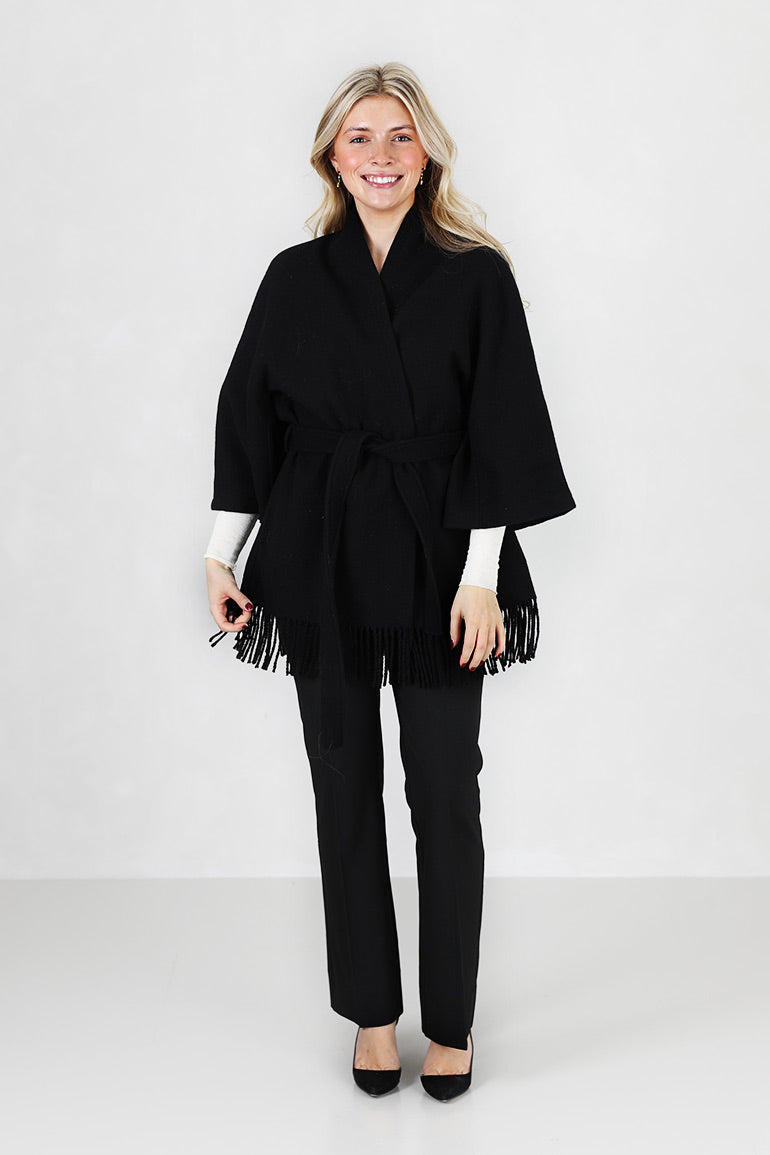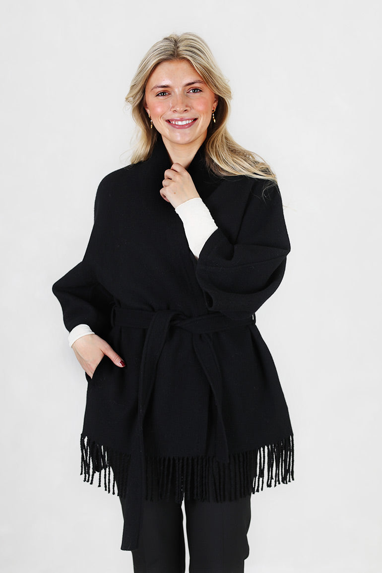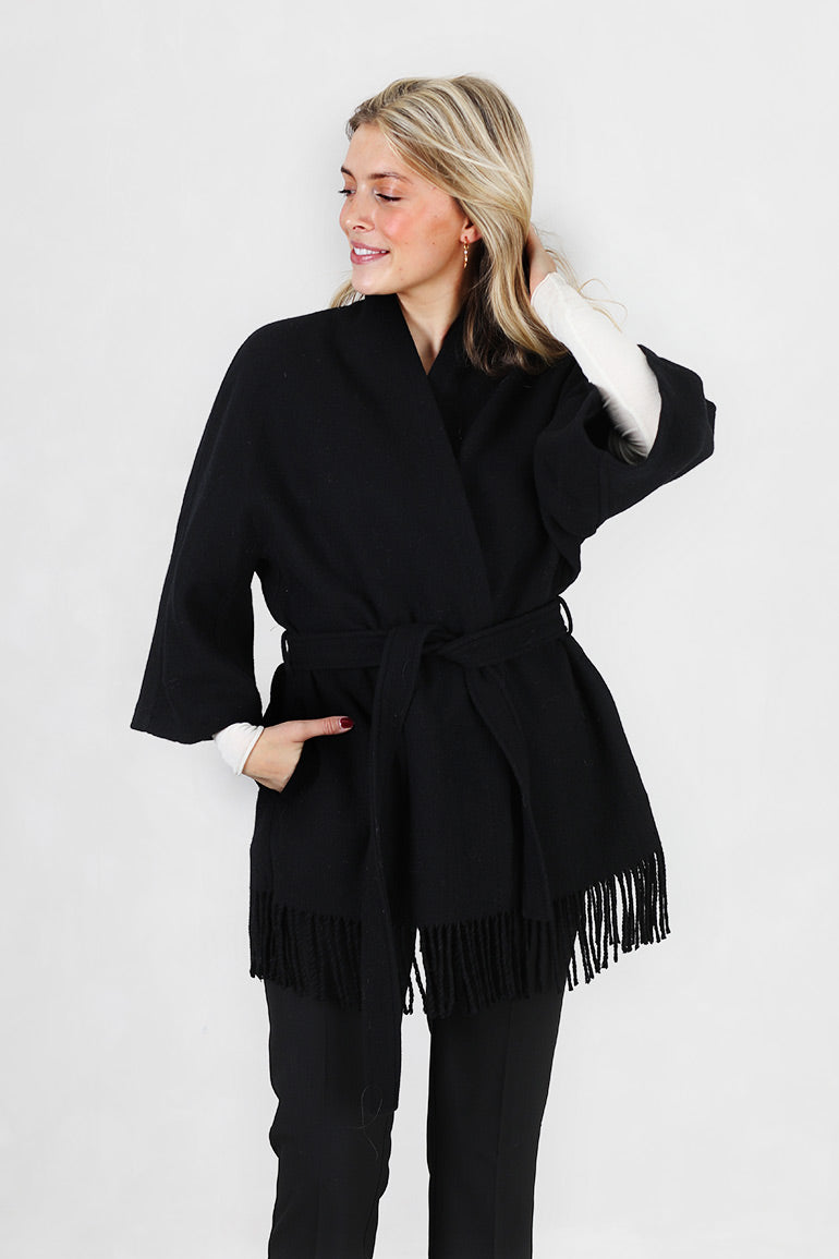 Signarurjakken til Christian Aks i klassisk sort! Lommer i sidene, løst knytebelte i livet og frynsekant nederst. Romslig modell.