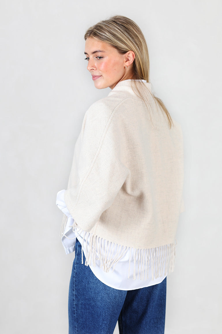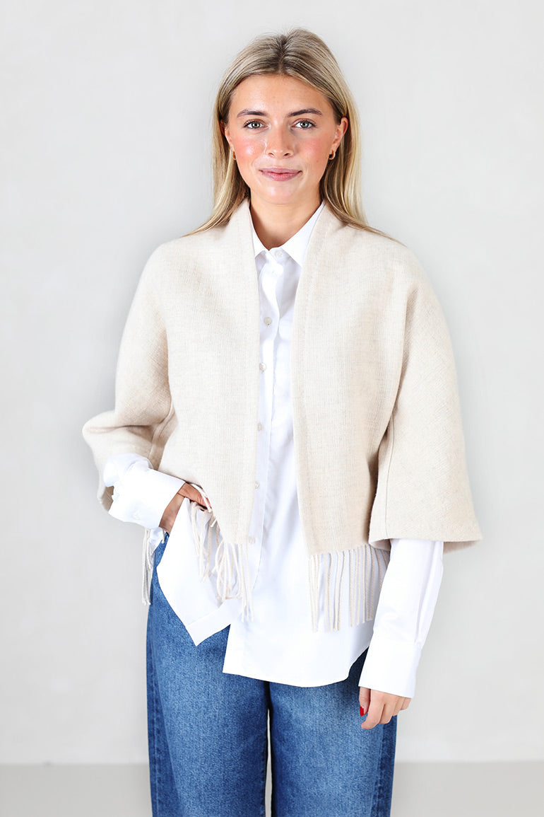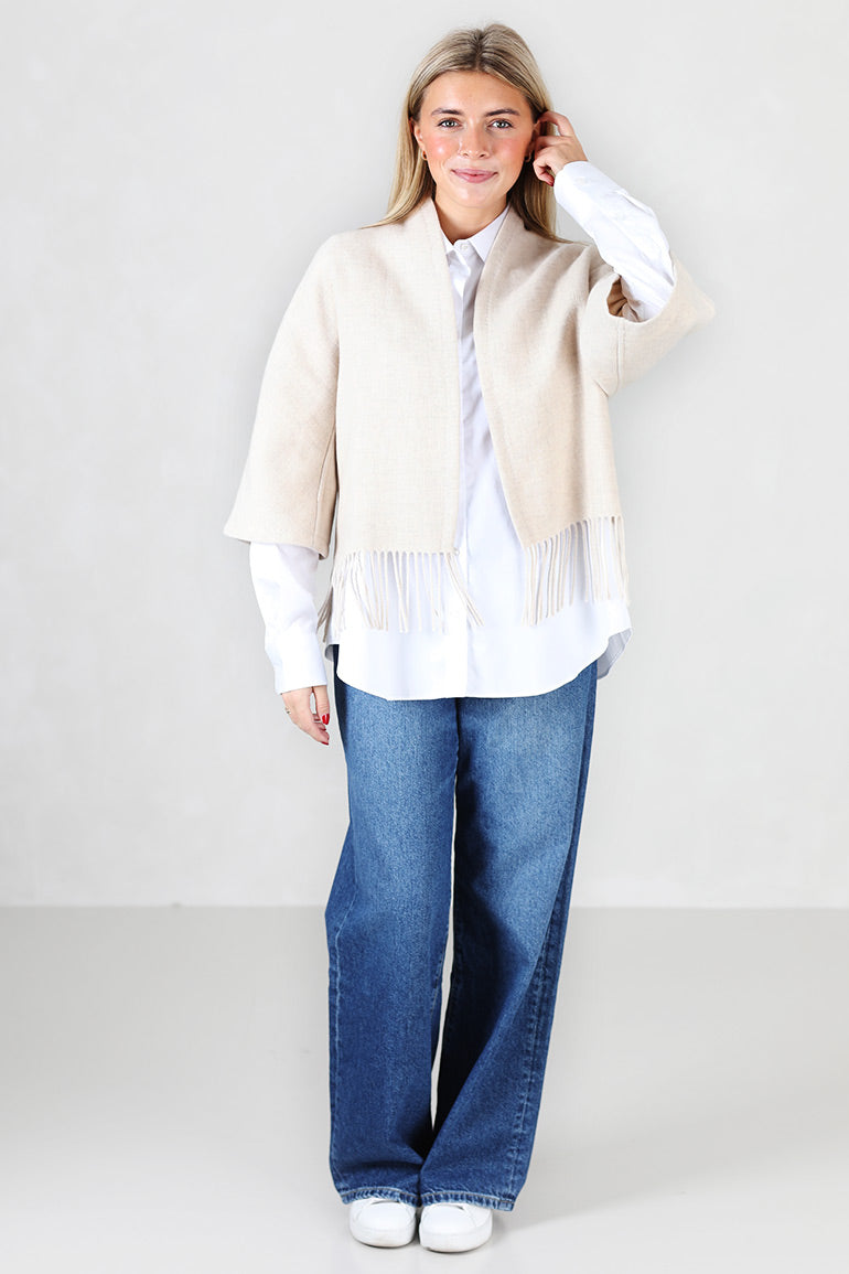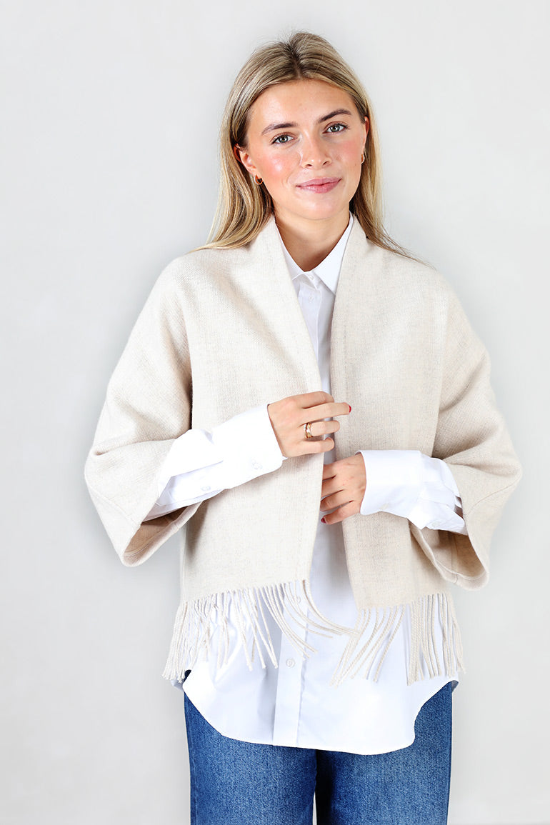 En kortere variant av den populære signaturjakken med frynser fra norske Christian Aks. Vakker creme farge. Like fin over en trøye, skjorte eller kjole. Fin som en ytterjakke utover høsten, men også fin som en dressjakke inne etterhvert.