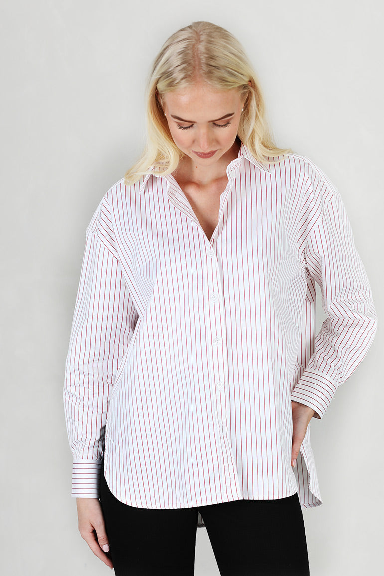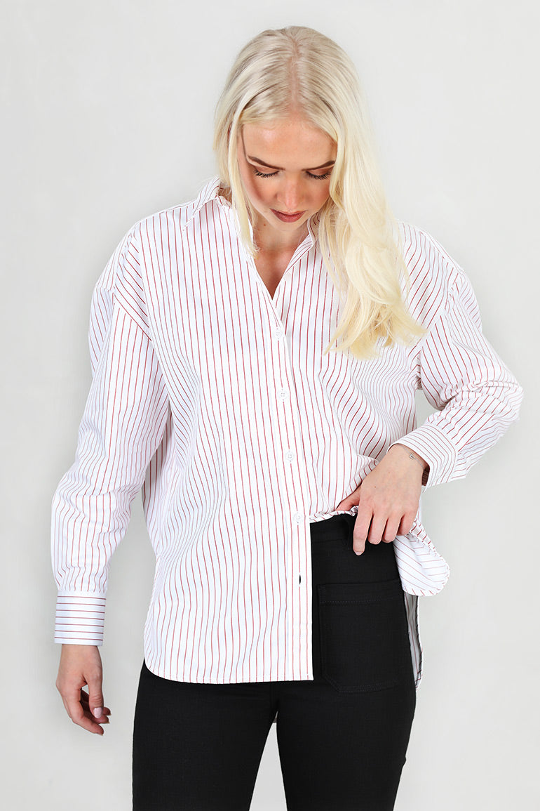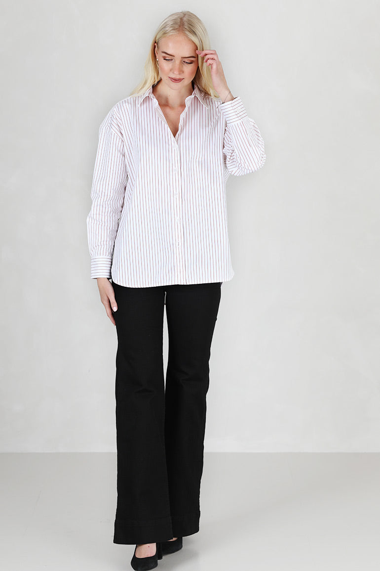 Utrolig fin skjorte fra Julie Josephine. Julie Josephine er kjent for å aldri gå på kompromiss med kvalitet og lager derfor klassiske styles som skal være med deg i garderoben i et langt liv. Denne skjorten er passe oversized og har en klassisk skjorte krage med knapper helt ned i front. Lange ermer med mansjett. Hvit bunn med brent orange/røde striper.