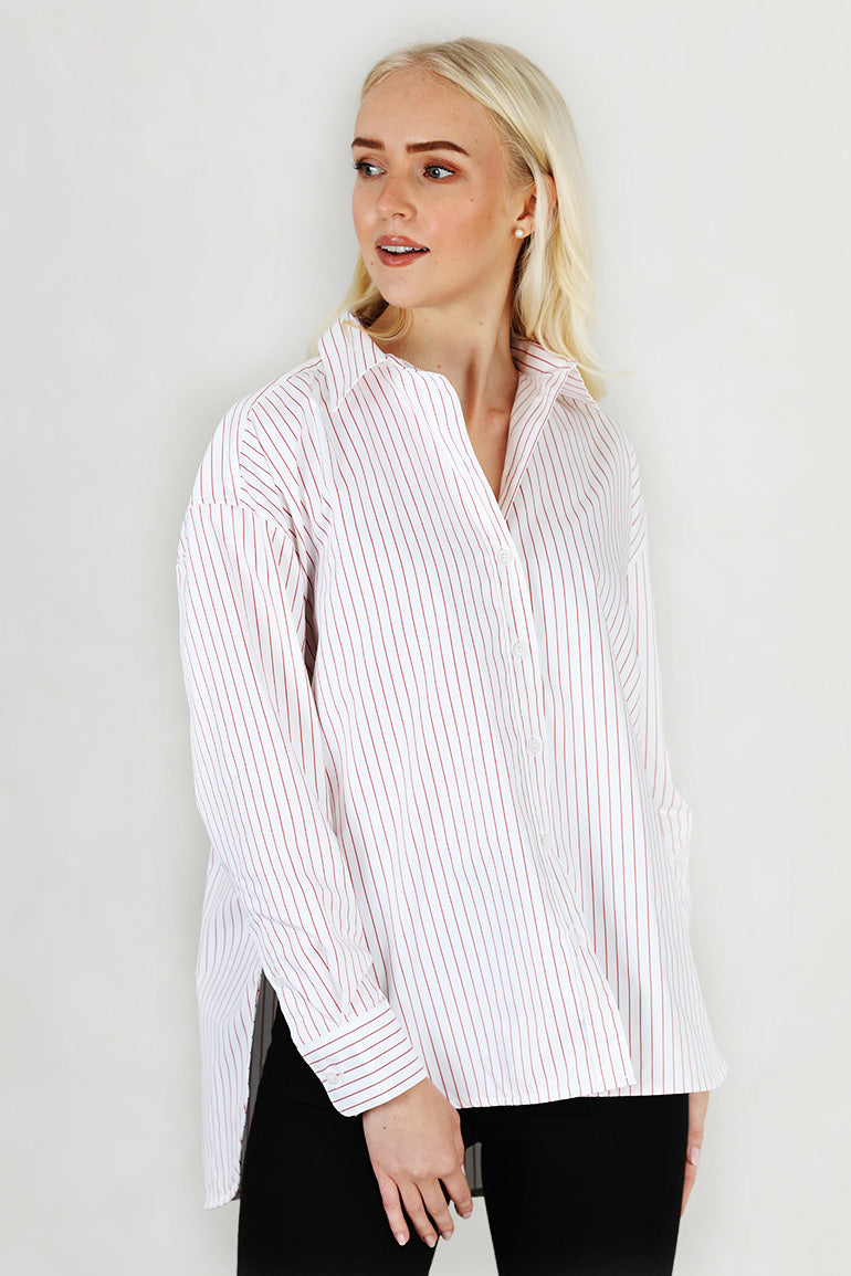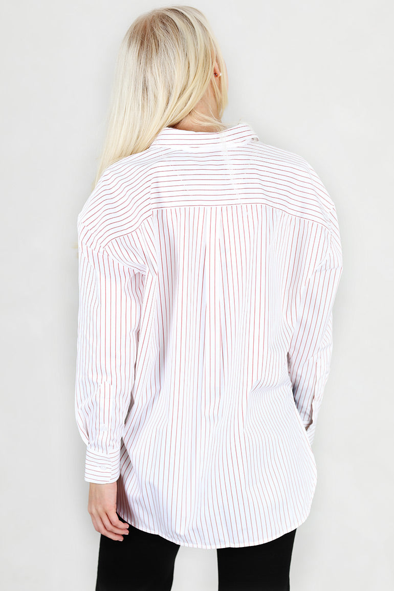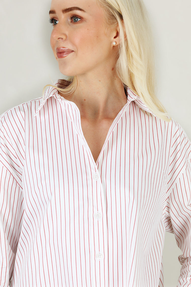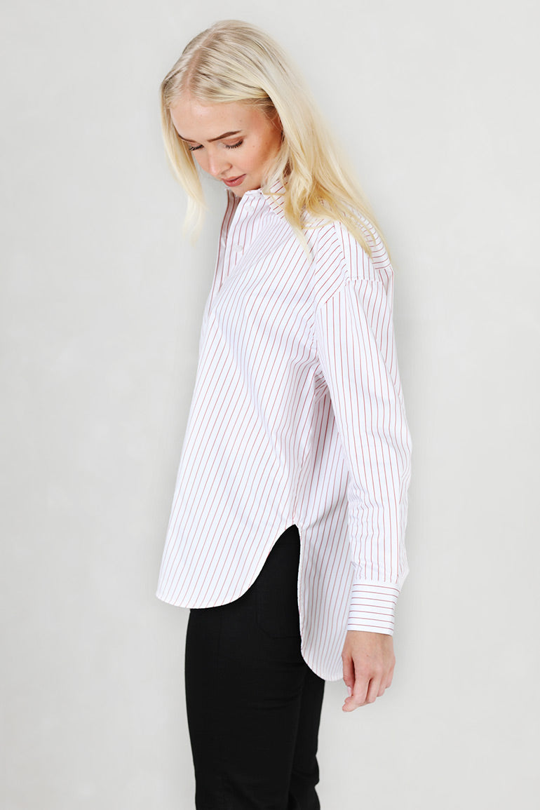 Utrolig fin skjorte fra Julie Josephine. Julie Josephine er kjent for å aldri gå på kompromiss med kvalitet og lager derfor klassiske styles som skal være med deg i garderoben i et langt liv. Denne skjorten er passe oversized og har en klassisk skjorte krage med knapper helt ned i front. Lange ermer med mansjett. Hvit bunn med brent orange/røde striper.