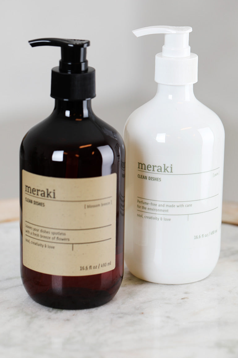 Meraki Pure oppvaskmiddel er en skånsom, effektiv og parfymefri oppvaskmiddel. Bare med noen få pump når du vasker opp, vil du oppleve hvordan glassene og tallerknene dine blir plettfrie og skinnende. Meraki oppvasksåpe er sertifisert av Astma-Allergi forbundet i Danmark og Svanemerket som gjør den skånsom mot huden din. Såpen kommer i en fin 490 ml flaske som vil pryde kjøkkenet ditt ved vasken.