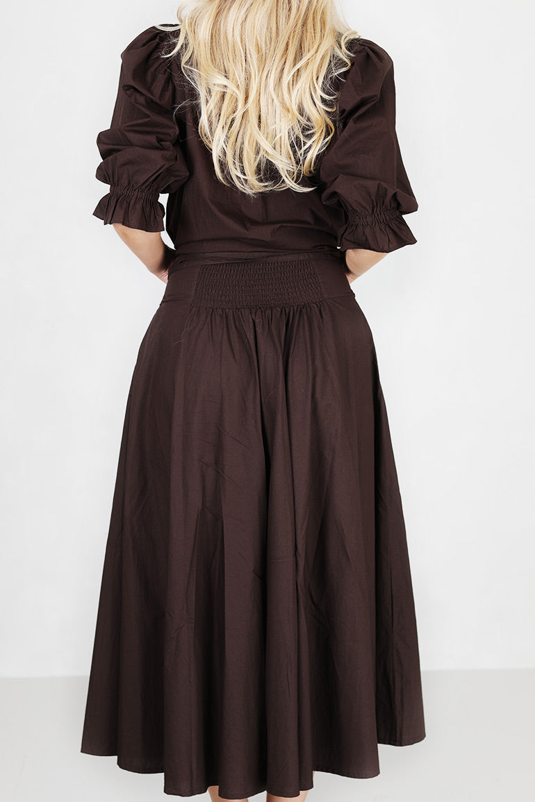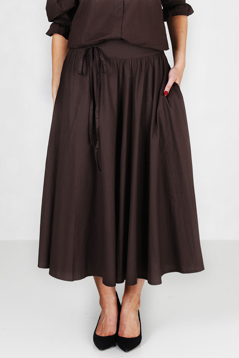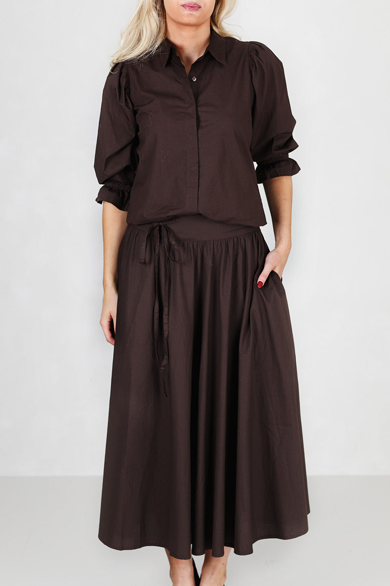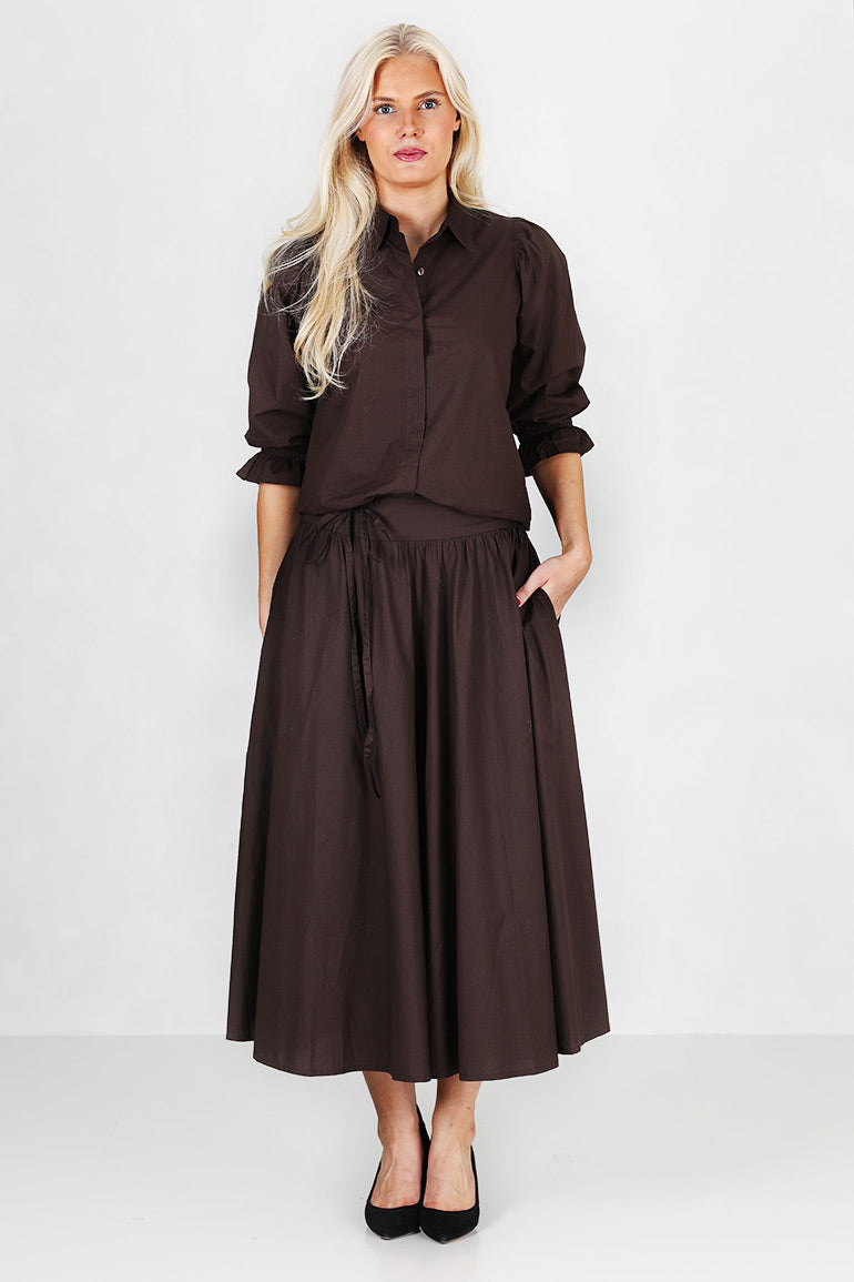Helt utrolig flott skjørt fra Missmaya i høstens store it farge; mørkebrunt. Strikk i livet bak, løst belte i livet som kan taes av. Glidelås. Midi lengde. Lommer i sidene.