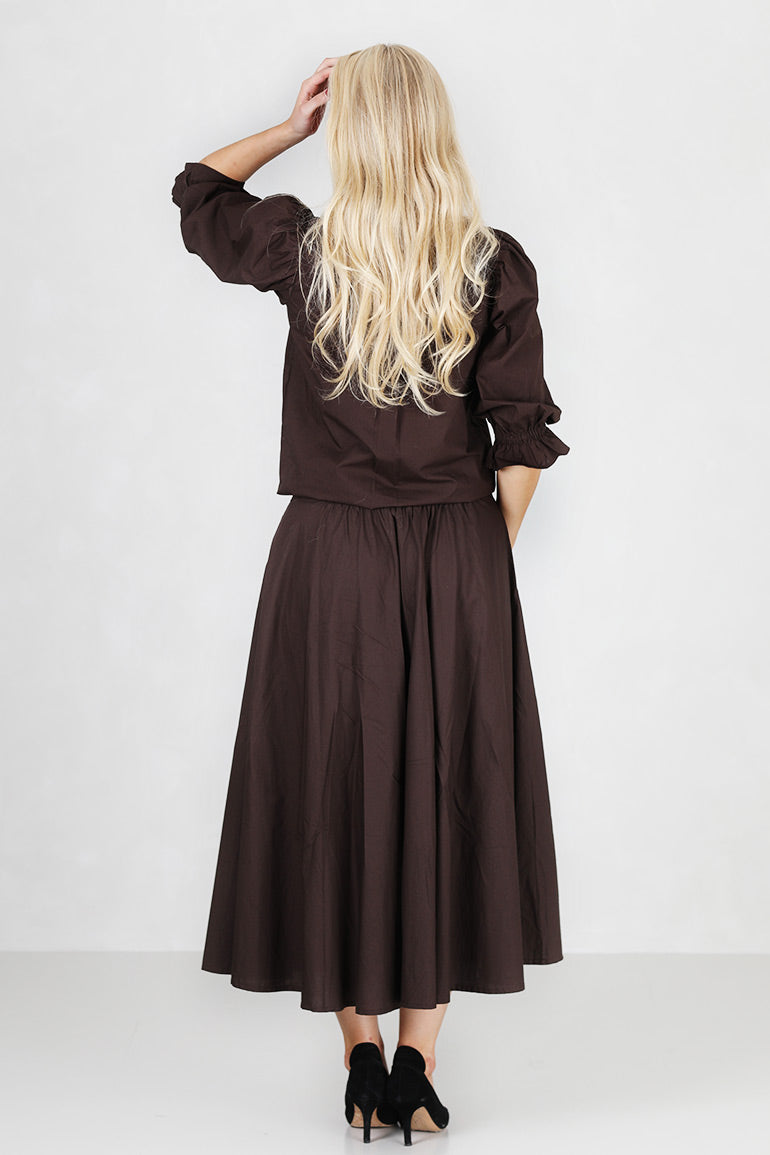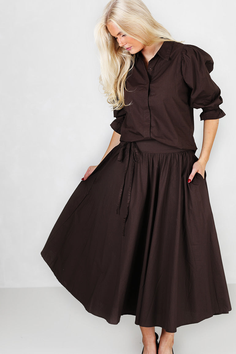 Den populære Amy skjorten fra Missmaya har kommet i sesongens store it farge; mørebrunt. Krage, skjult knappestolpe helt ned og 3/4 lange ermer med strikk. Små, forsiktige puffermer.