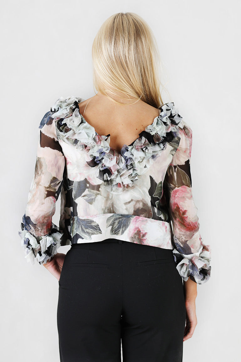 Nydelig bluse fra byTiMo som kan brukes begge veier. Velg om du vil ha rund hals og utrigning i ryggen, eller v-hals utrigning foran og rund hals bak. Lange, forsiktig gjennomsiktige ermer med blomsterdetaljer i ermer og i halsen.
