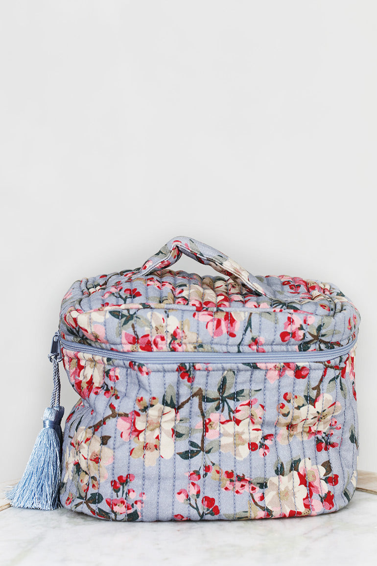 Utrolig flott beauty bag fra byTiMo i et vakkert blått print. Deilig og myk kvalitet. Lyseblå avtagbare dusker.