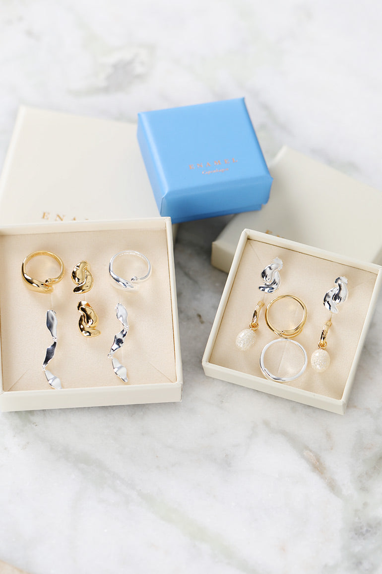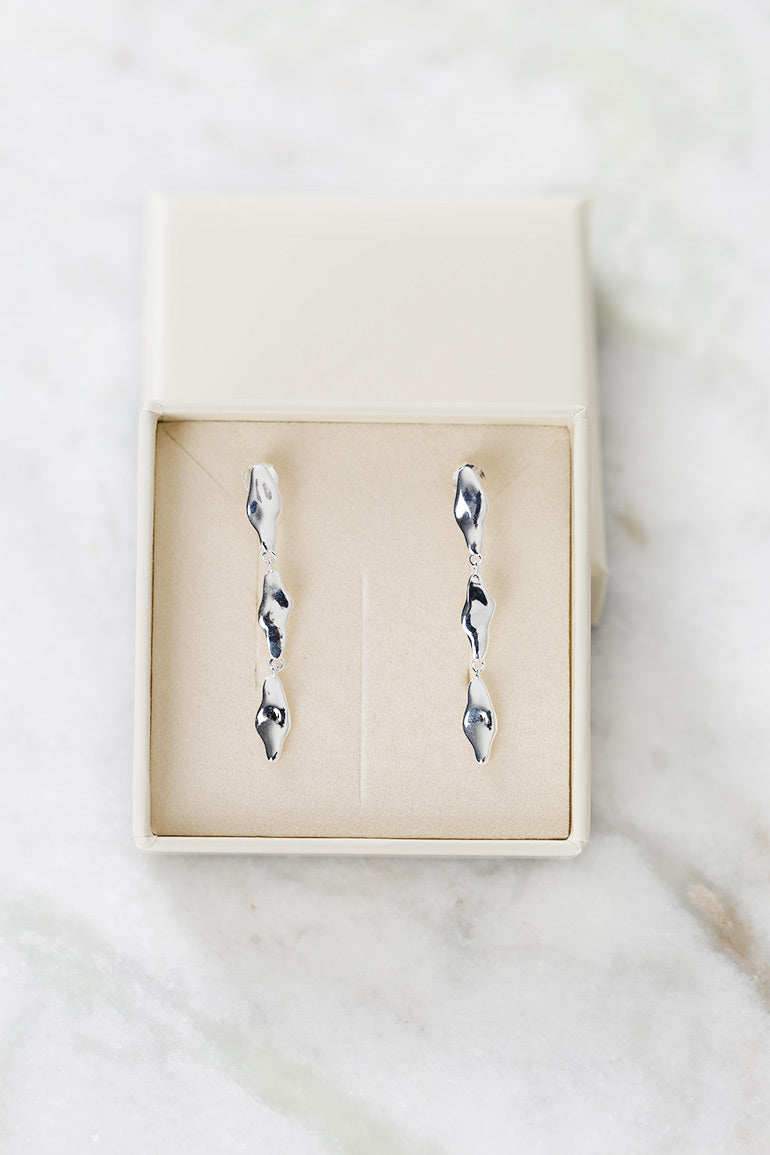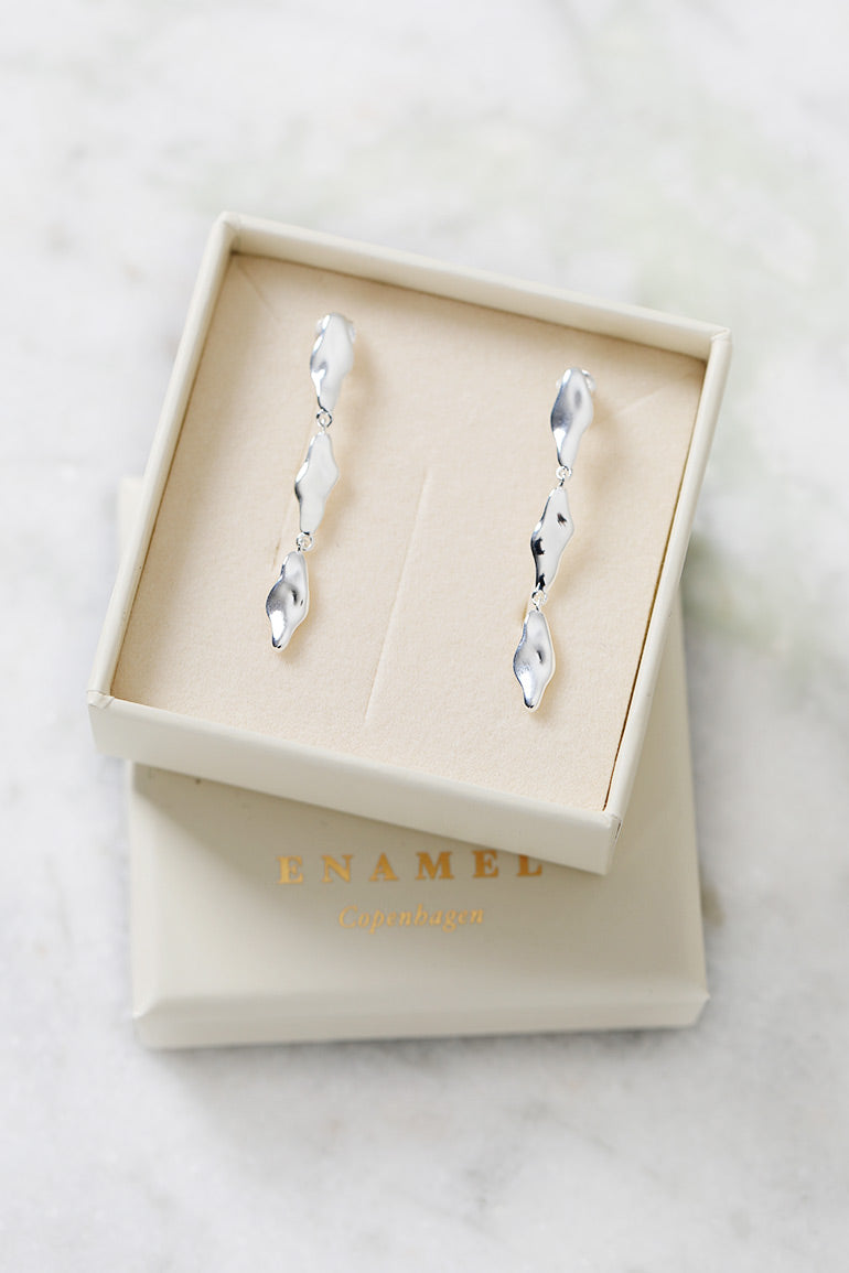 Vakre øredobber fra Enamel Copenhagen. Tre håndlagde ledd, som danner en slank og organisk silhuett. Designet har fortsatt den eksklusive og iøynefallende uttrykk, men i en lettere og mer hverdagslig versjon. Det perfekte smykket for deg som ønsker noe spesielt - selv når det ikke er fest.