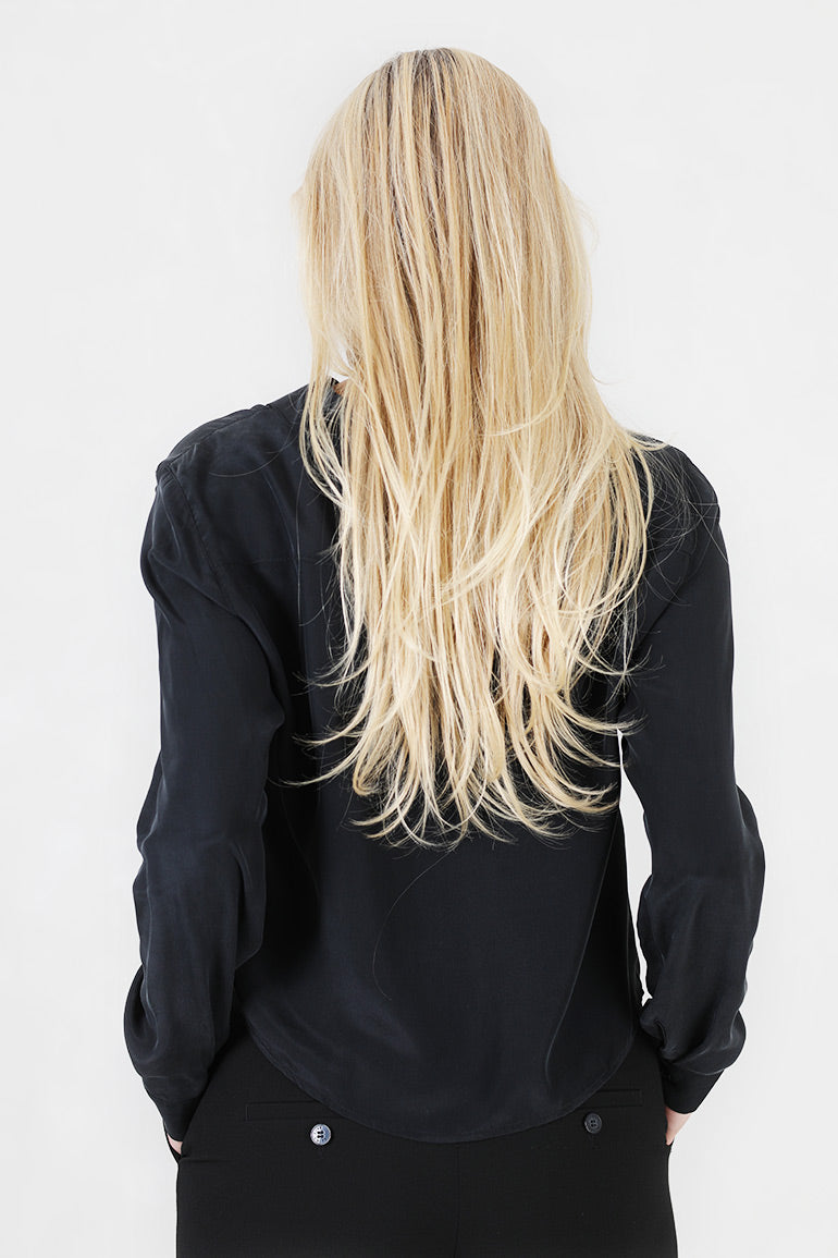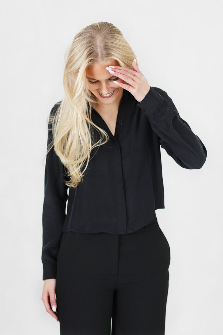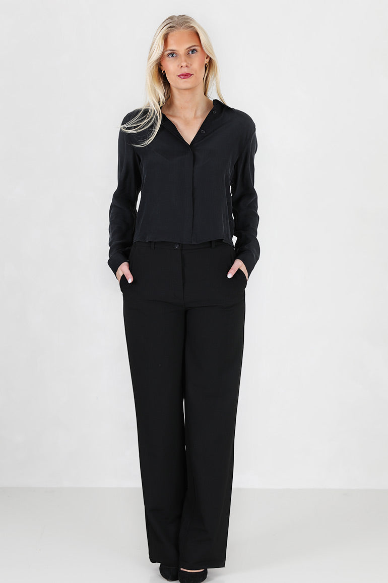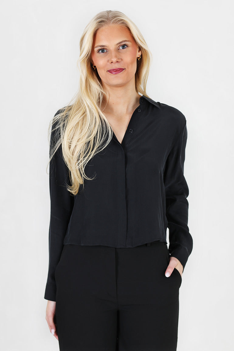 Nydelig silkebluse fra danske My essential waardrobe. Kort modell med krage og knappestolpe hellt ned. Lange ermer.