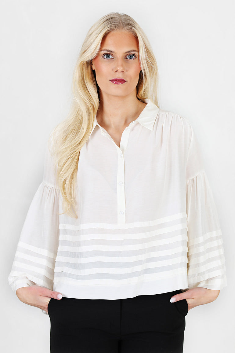 Vakker bluse fra danske Munthe i offwhite. Vide ermer, krage og knappestolpe ned over brystet. A-shape som faller vakkert.