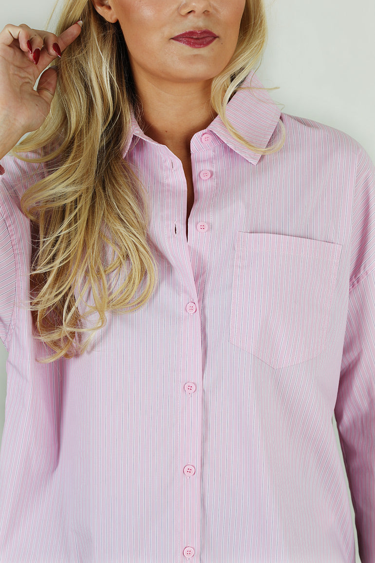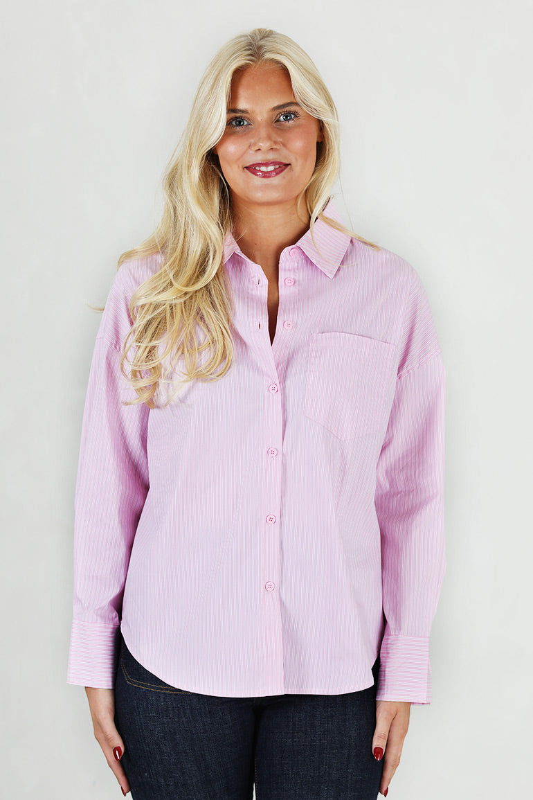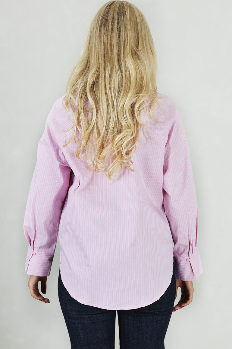 Utrolig fin skjorte fra vårt nyeste merke - nytt i Norge - rett fra Paris: Grace & Mila. Oversized passform, hvit og rosa striper. Lange ermer, klassisk skjorte modell med krage og knapper helt ned.