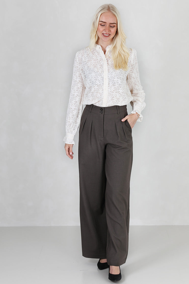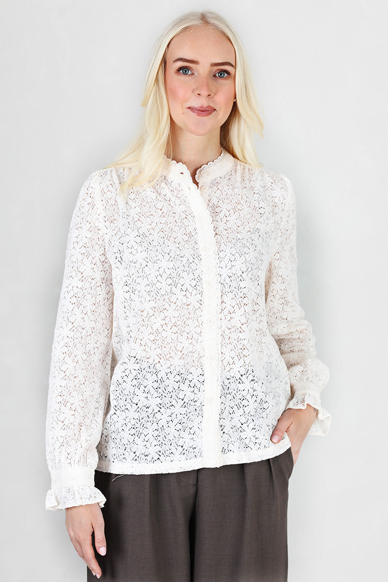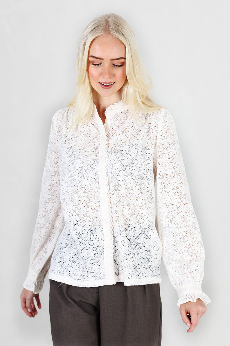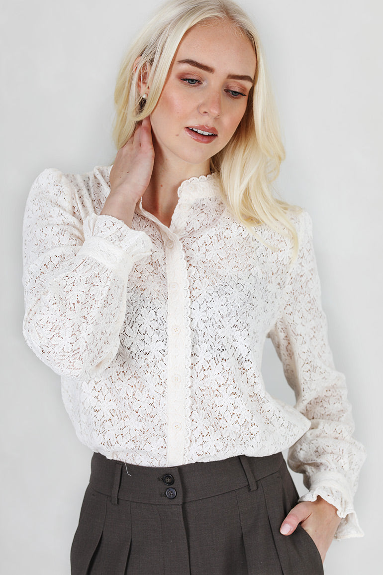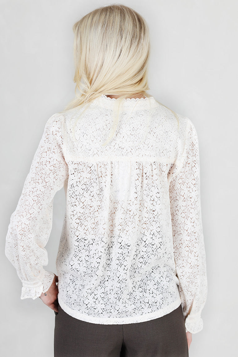 Nydelig blondebluse fra vårt nyeste merke - rett fra Paris - Grace & Mila. Delikate blonder, lange ermer med små volanger, knappestolpe helt ned.