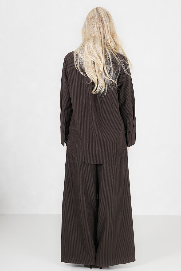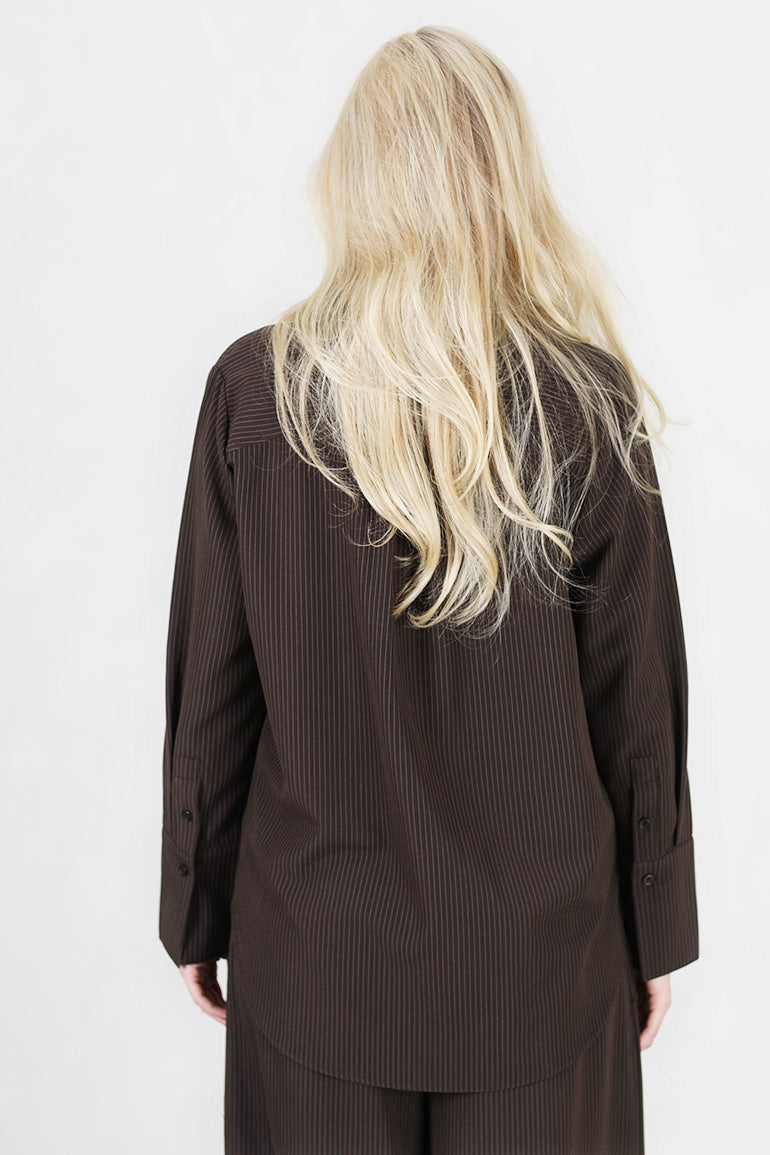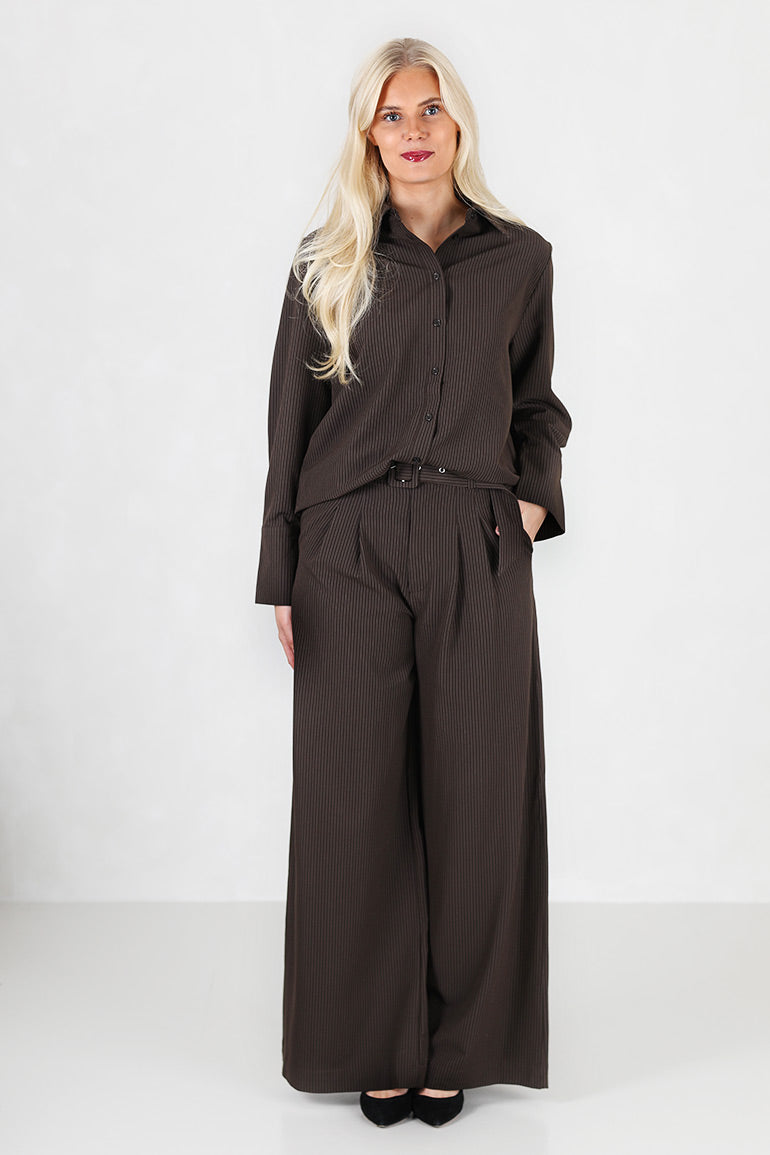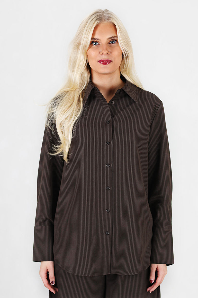 Vi elsker dette settet - og særlig denne skjorten. Nå har den kommet i den perfekte mørkebrune fargen med forsiktige pinstriper. Deilig, oversized skjorte fra danske My essential wardrobe. Klassisk krage, knappestolpe og lange ermer.
