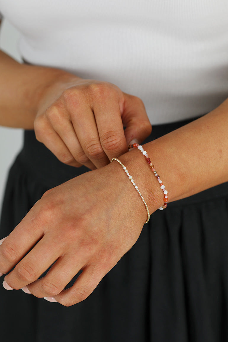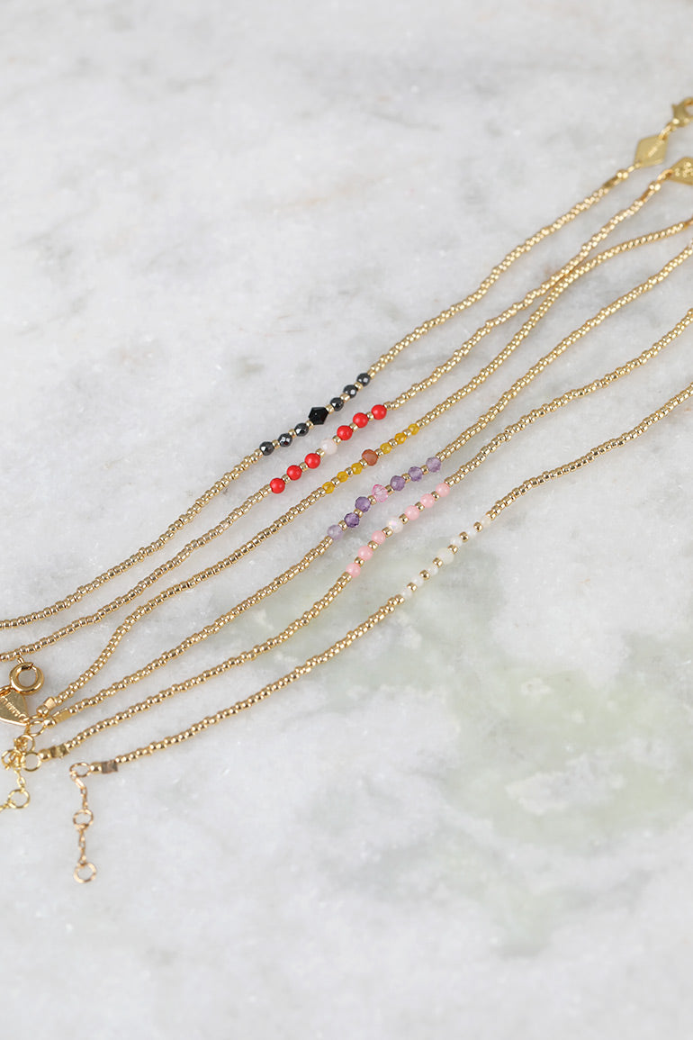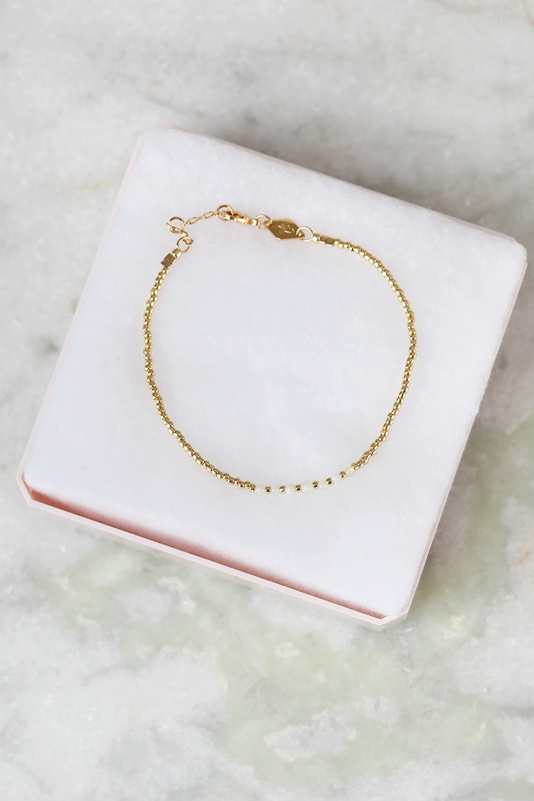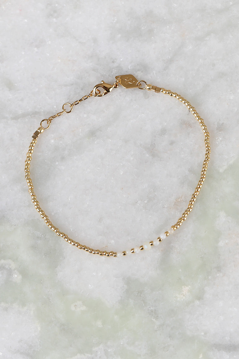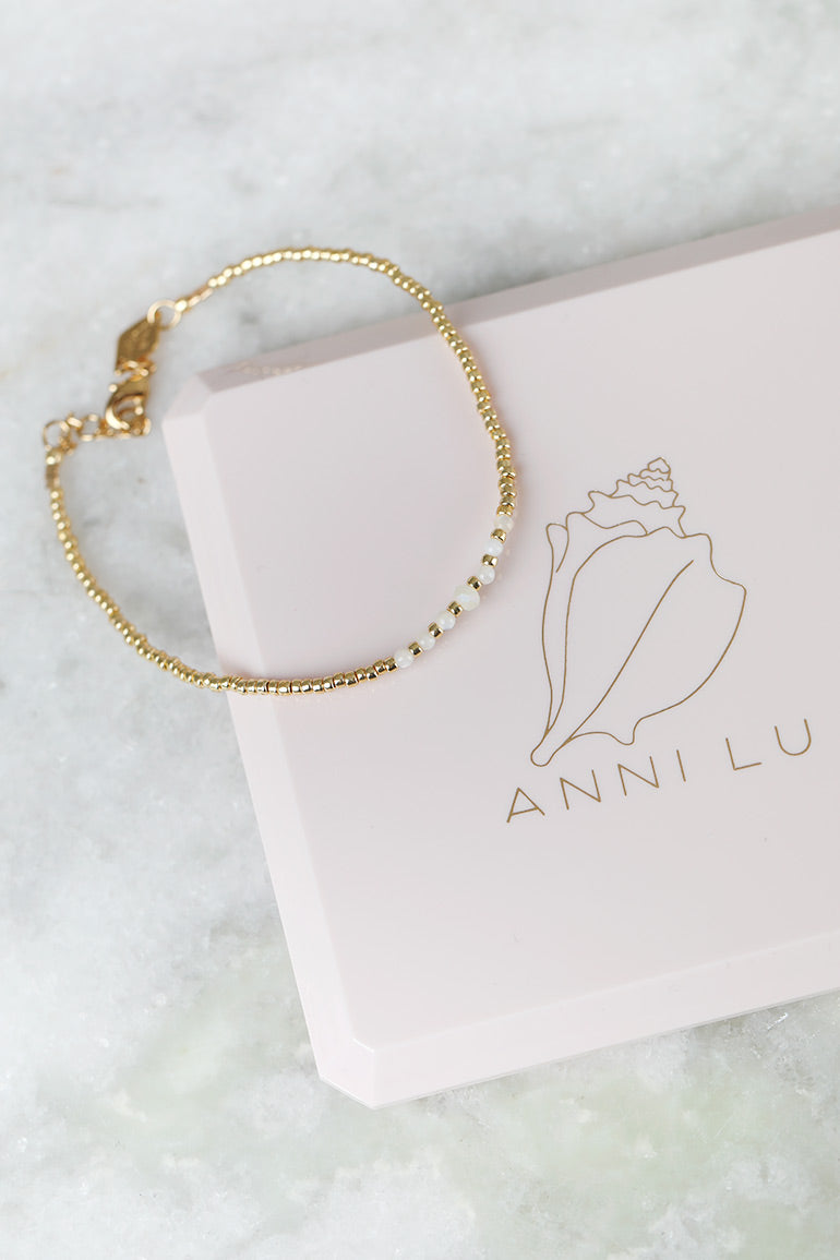 Vi elsker armbåndene til vår store smykkefavoritt Anni Lu! Superfine alene, men fantastiske sammen i ulike kombinasjoner. Gullkuler og halvedelstener. Alle smykkene er laget for hånd, og designet av danske Helle Vestergaard Poulsen som har jobbet som Art Director og Creative director i mange ulike magasin oppgjennom årene. Hennes visjon er å lage delikate og pene smykker som ikke selges overalt. Lengde: 15,5-18 cm. // Brass with 18kt goldplating // Detailed in seed beads, gemstone and crystal.