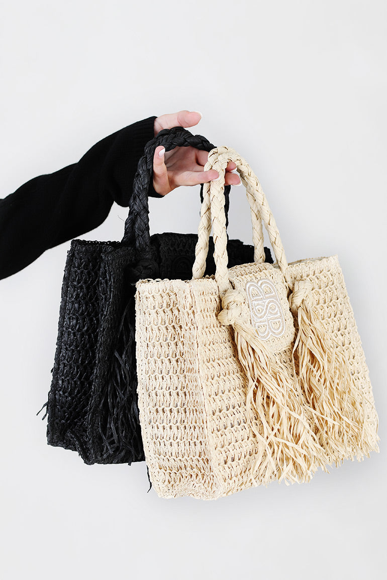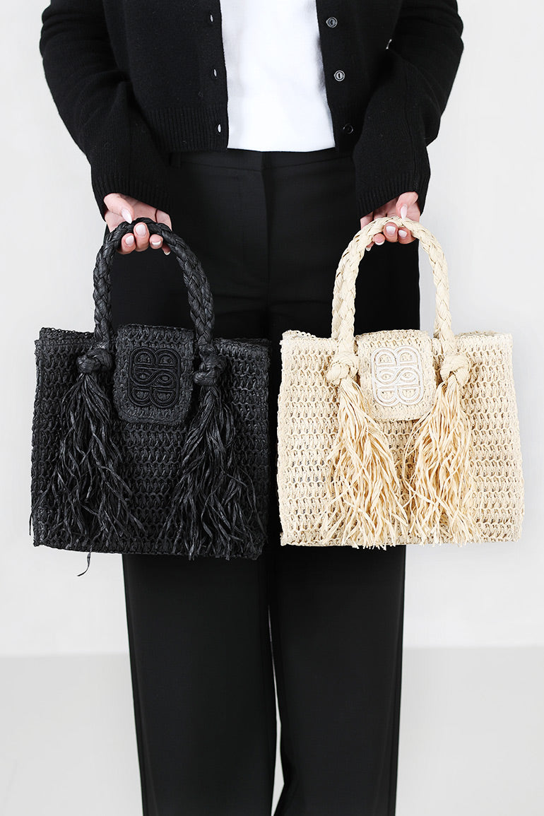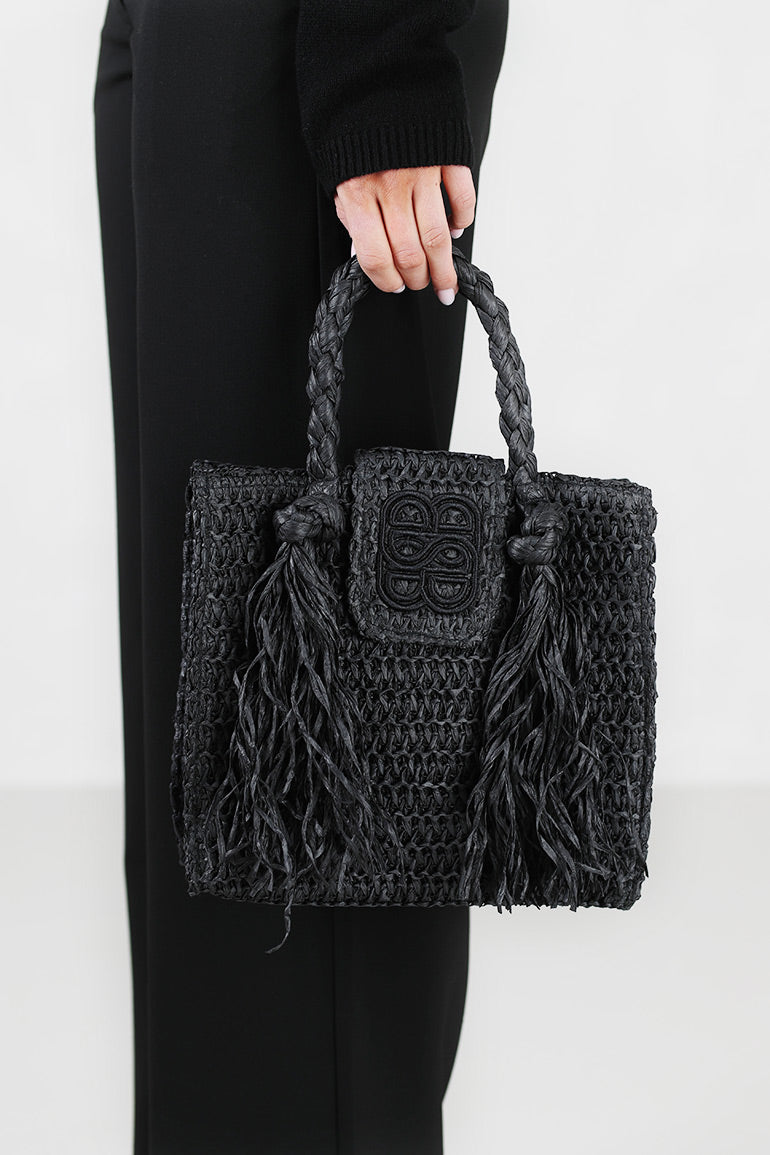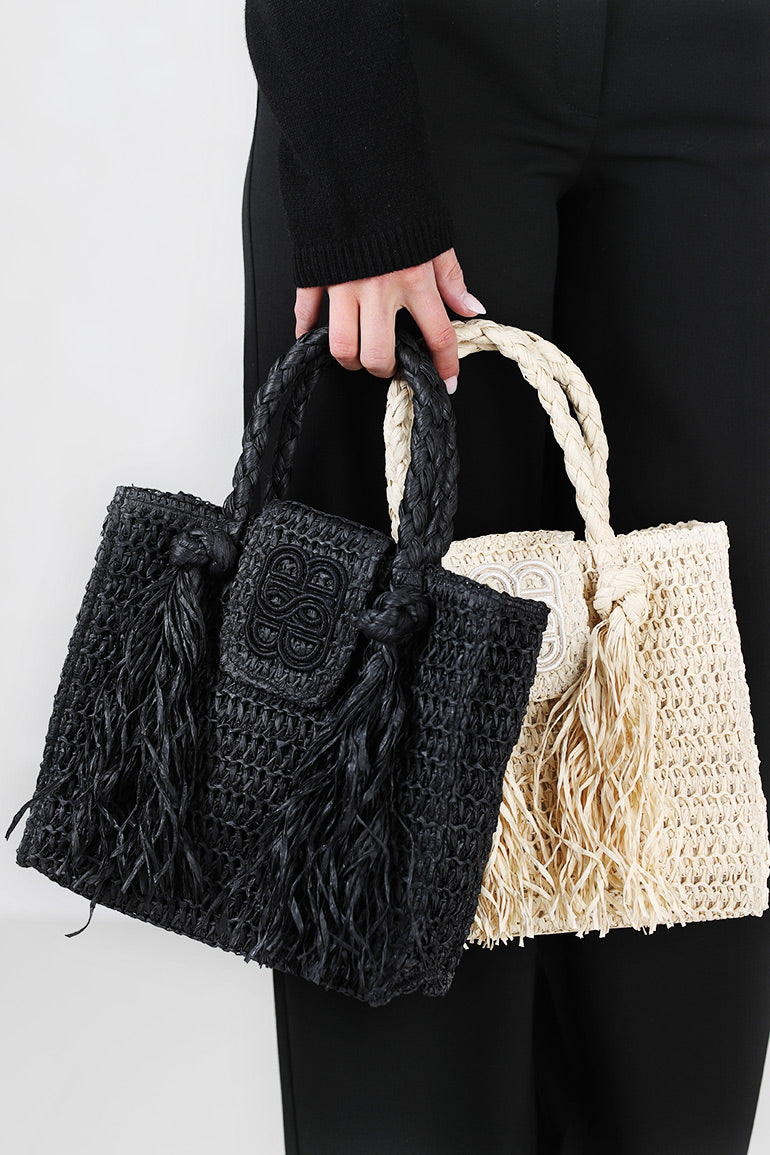 Skjønn liten veske fra Ella & il med ton-i-ton logo foran og dusker.