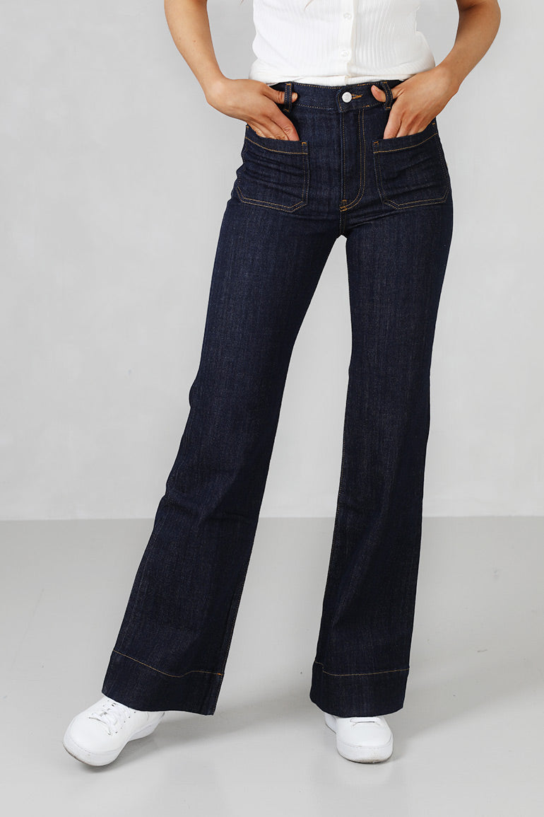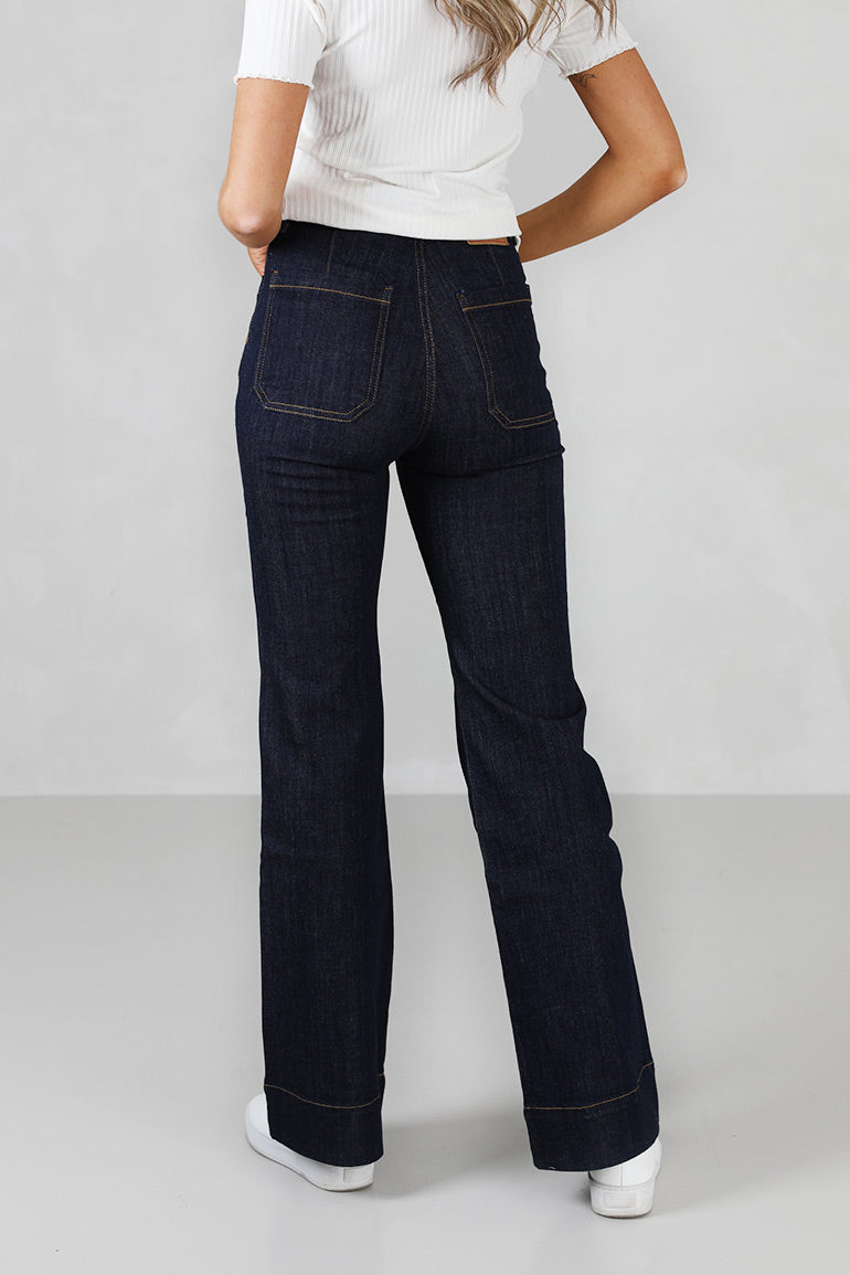 Den perfekte rådenim vasken i alltid populære St Monica jeansen fra våre svenske venner i Jeanerica. Mørkeblå med orange kontrastsømmer. Høyt liv, stretch og firkantede lommer foran og bak. Fin forsiktig sleng med bred kant.