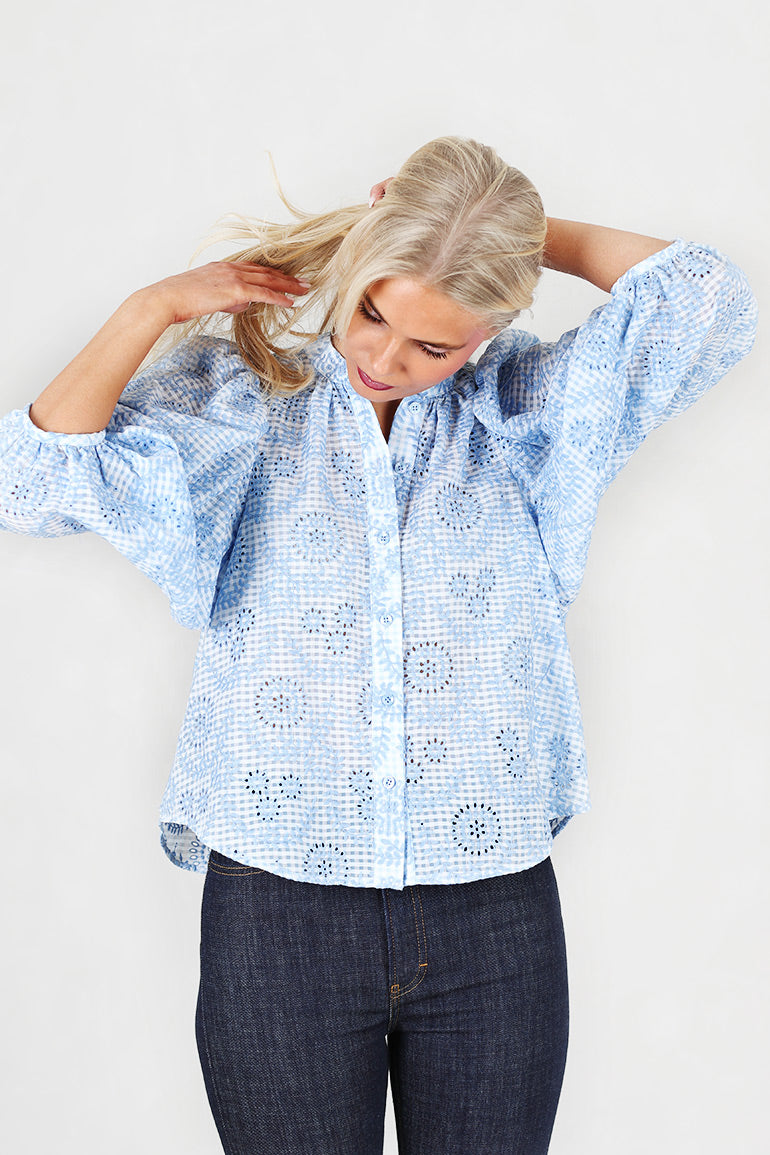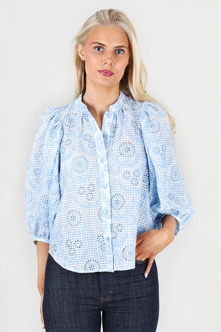 En helt utrolig fin bluse i lyseblå/offwhite med vakkert hullmønster fra byTiMo. 3/4 lange ermer, skjult knappestolpe helt ned. Forsiktig puff ermer.
