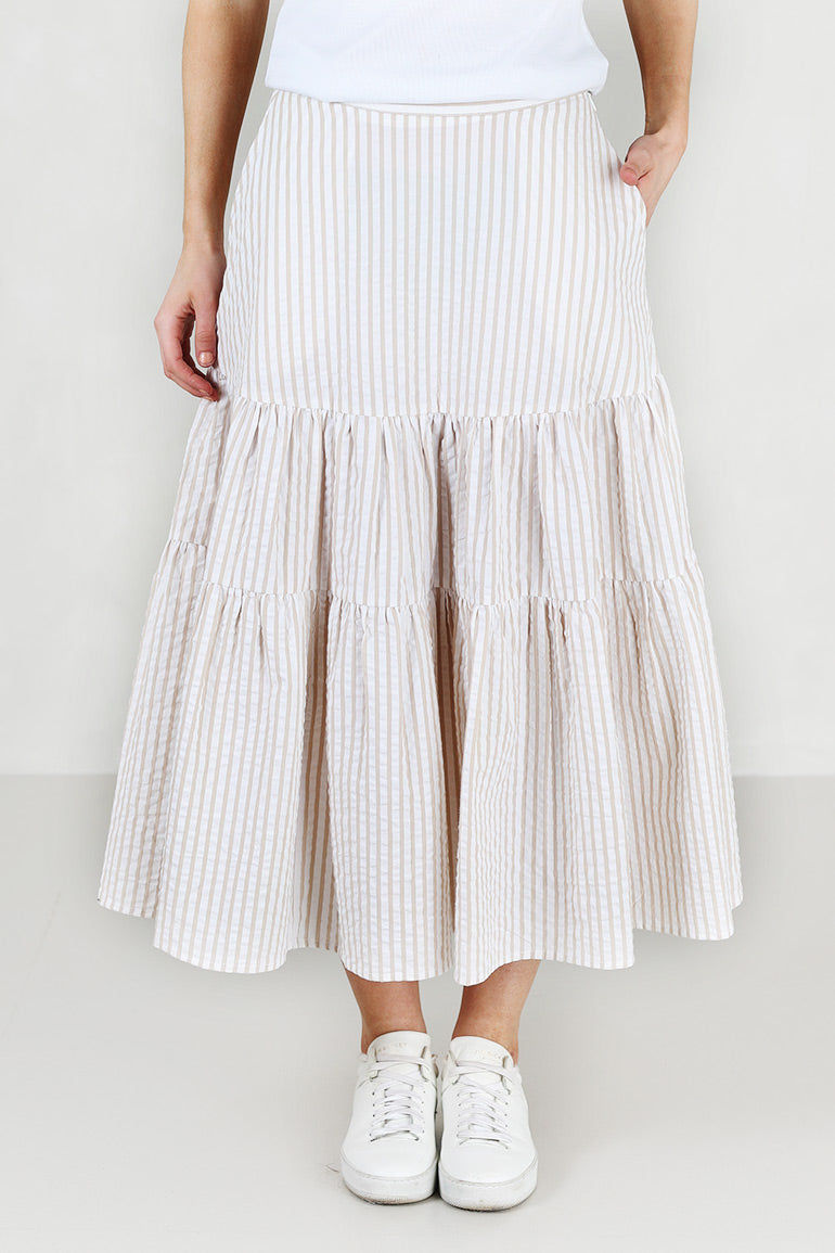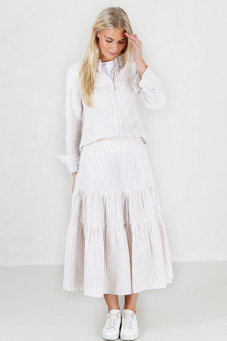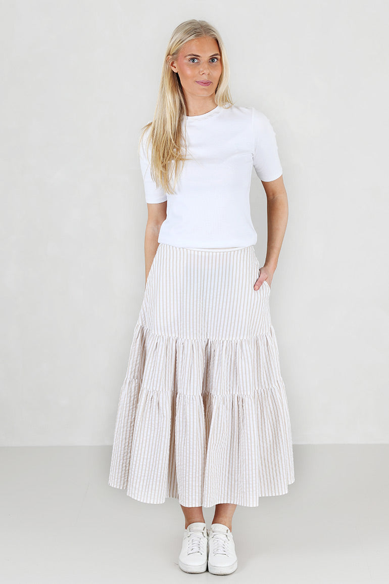 Midi skjørt fra byTiMo i deilig kreppkvalitet. Hvit bunn med beige striper. Lommer i sidene.