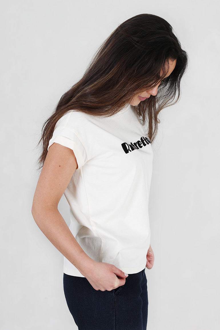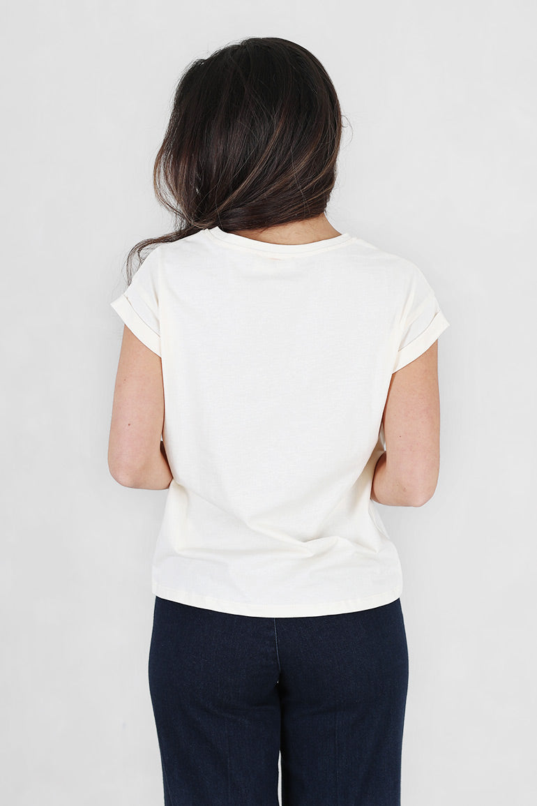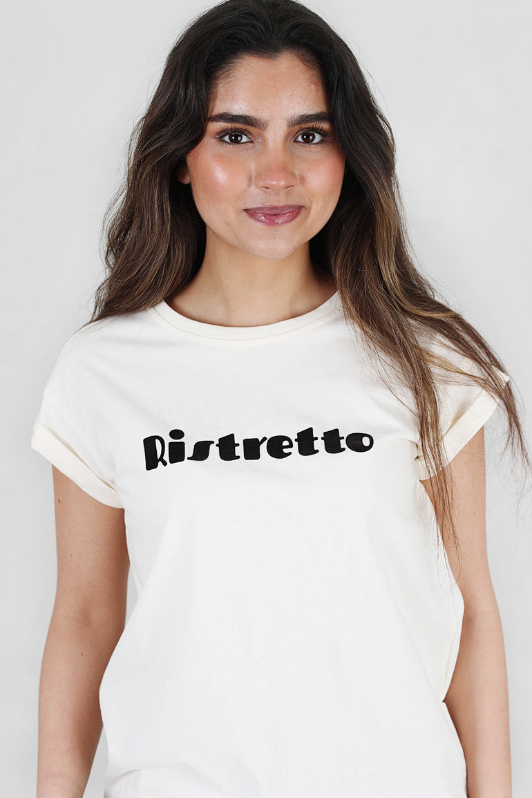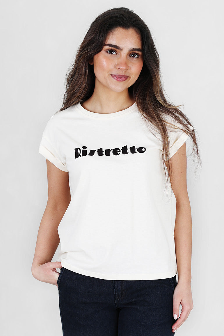 Deilig t-shirt fra franske Grace & Mila i en gyllen offwhite farge med brun tekst foran. Korte ermer med en liten oppbrett.