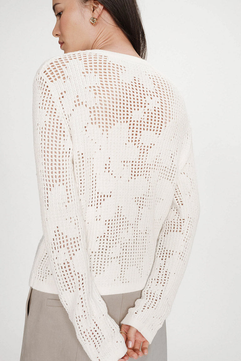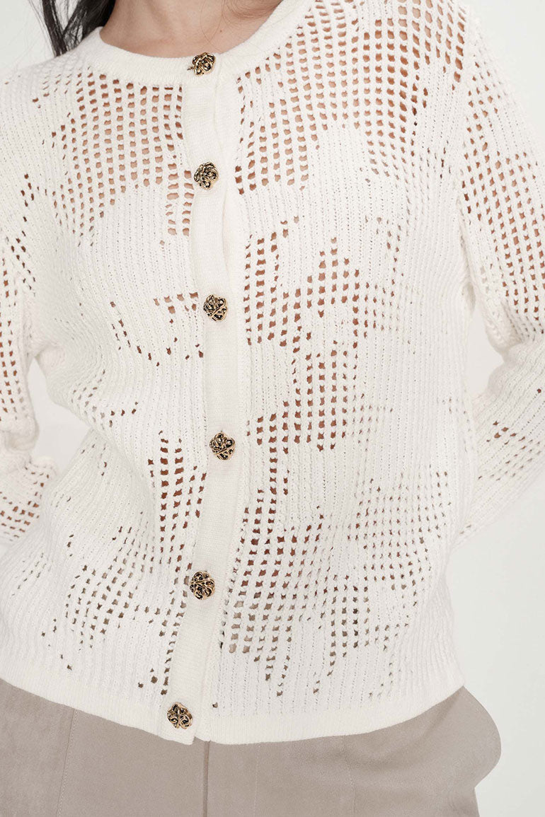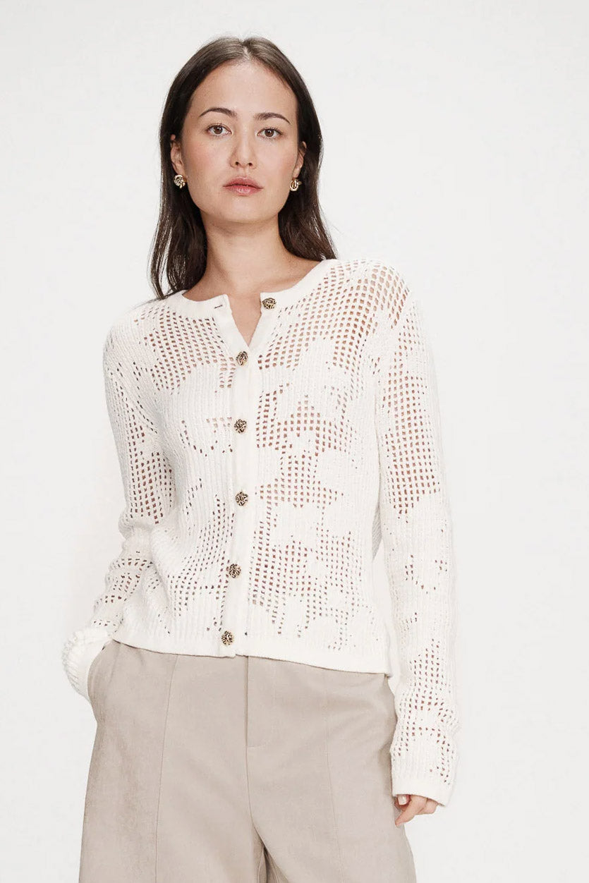 Nydelig cardigan fra franske Grace & Mila i blondemønster. Hvit med fine gullknapper. Lange ermer, smal modell.