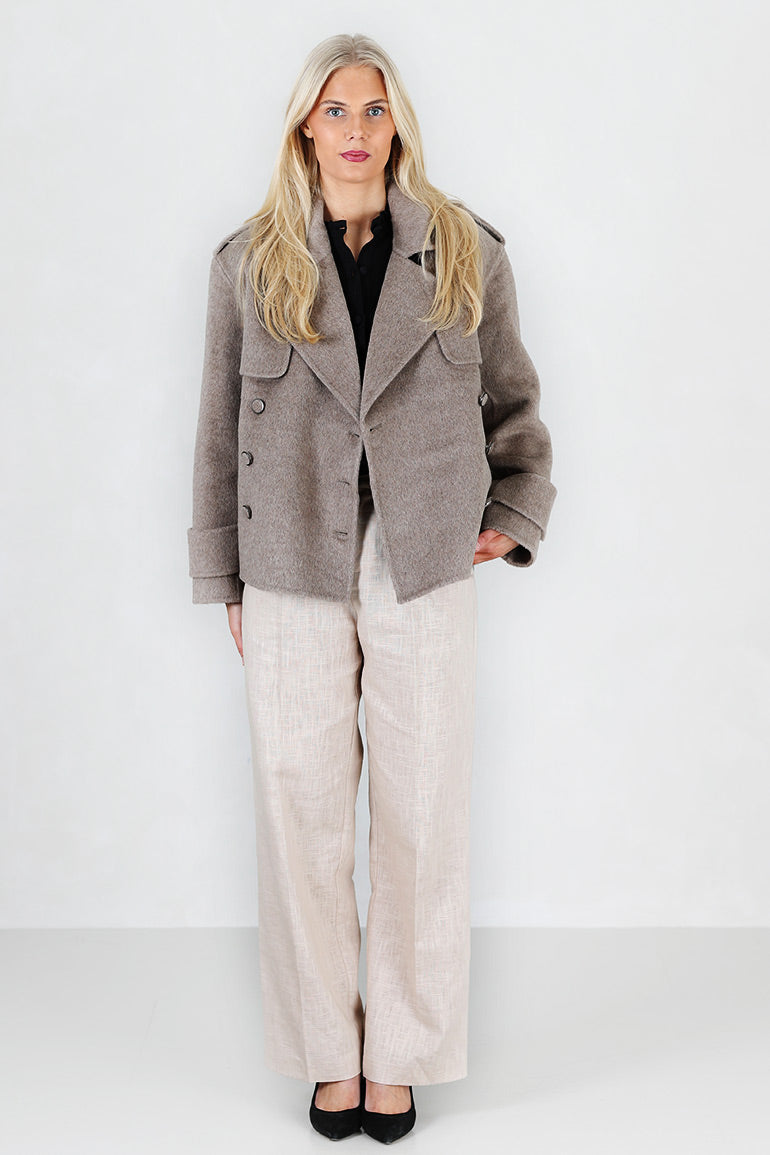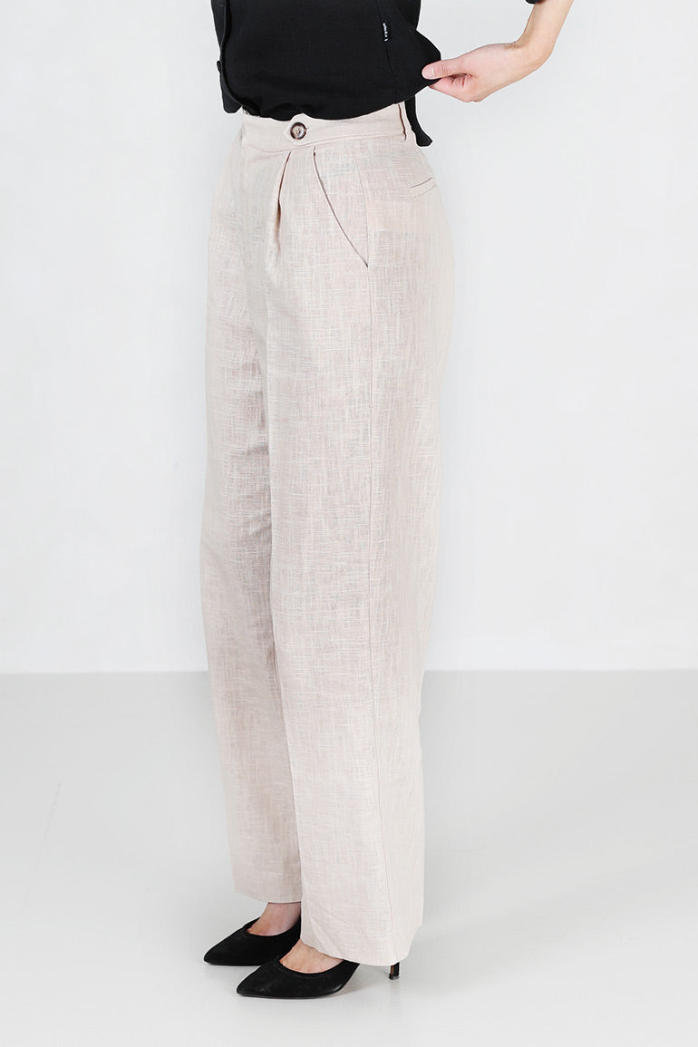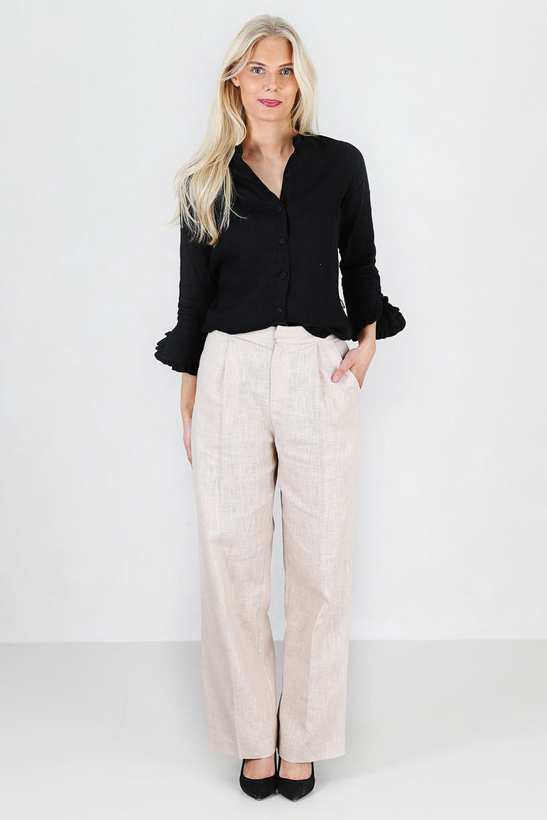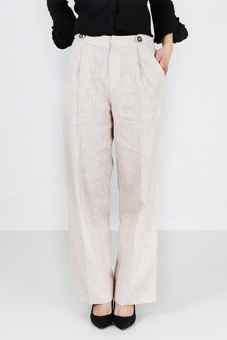 Superfine linbukser fra våre franske venner i Grace & Mila. Pene brune knappedetaljer i front, lommer i sidene og full lengde. Fin bege farge og kul struktur i linen.