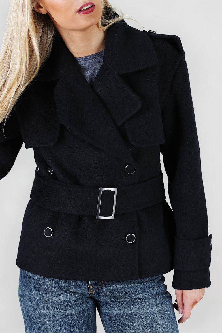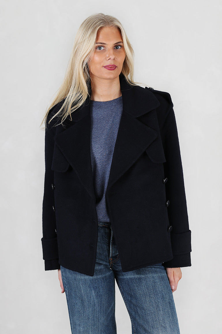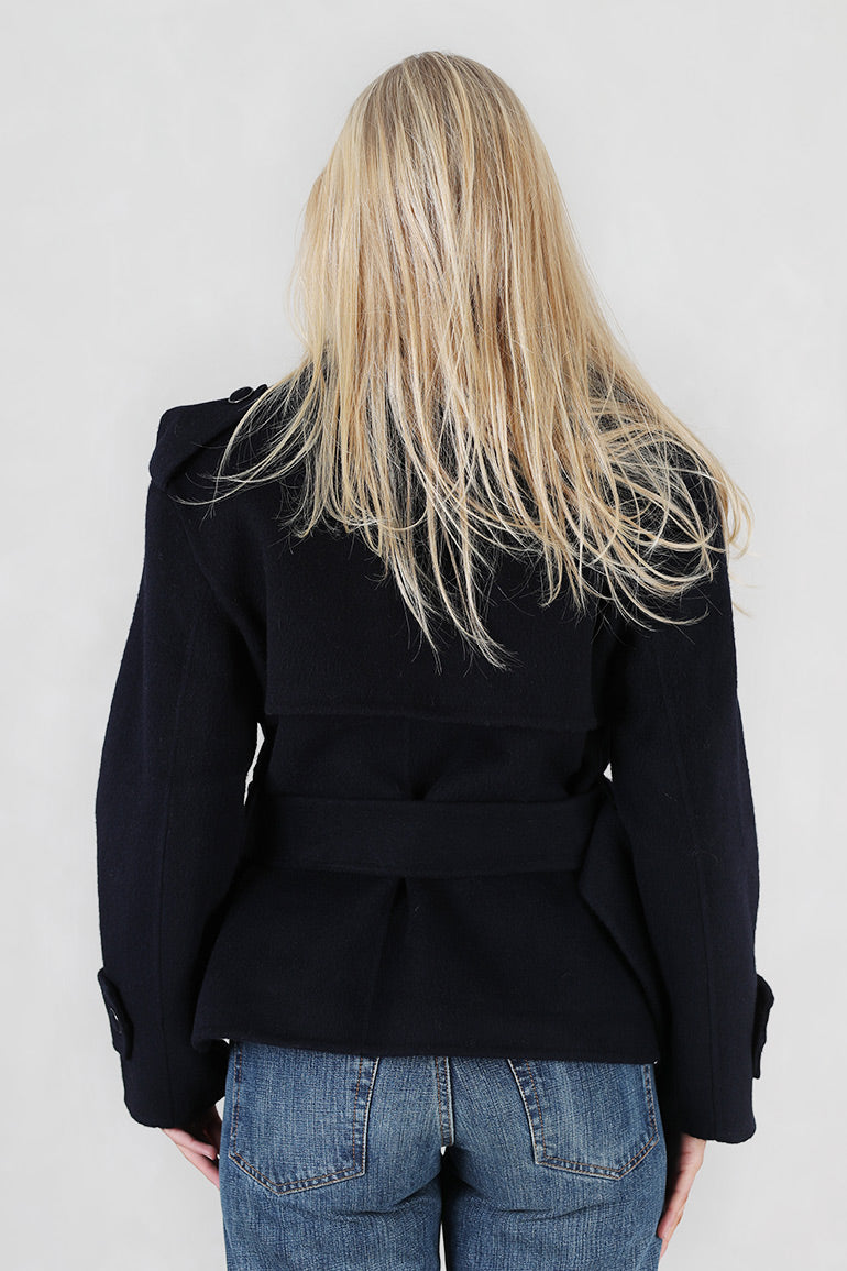 Ny ulljakke fra Ella & il i dyp mørkeblå farge og fantastisk kvalitet. Mange fine deltaljer som hemper på skuldre, legg bak og foran. Dobbeltspent. Belte i livet som kan tas av.