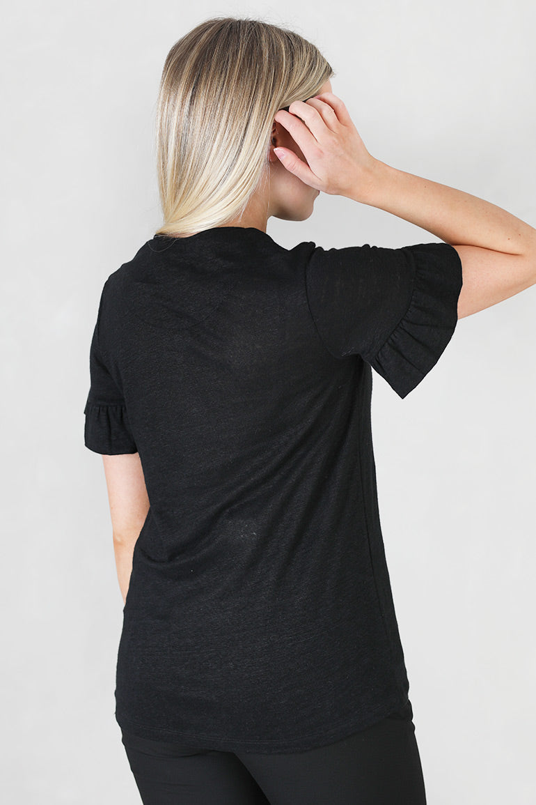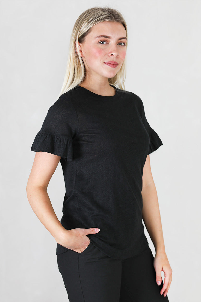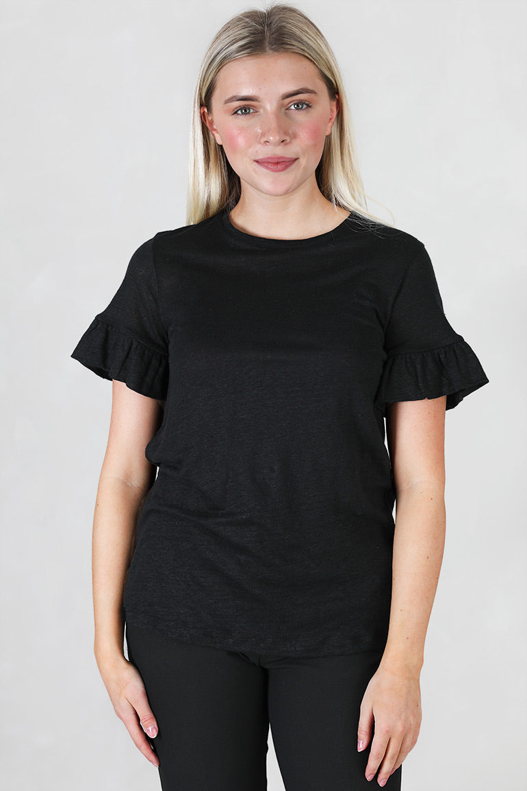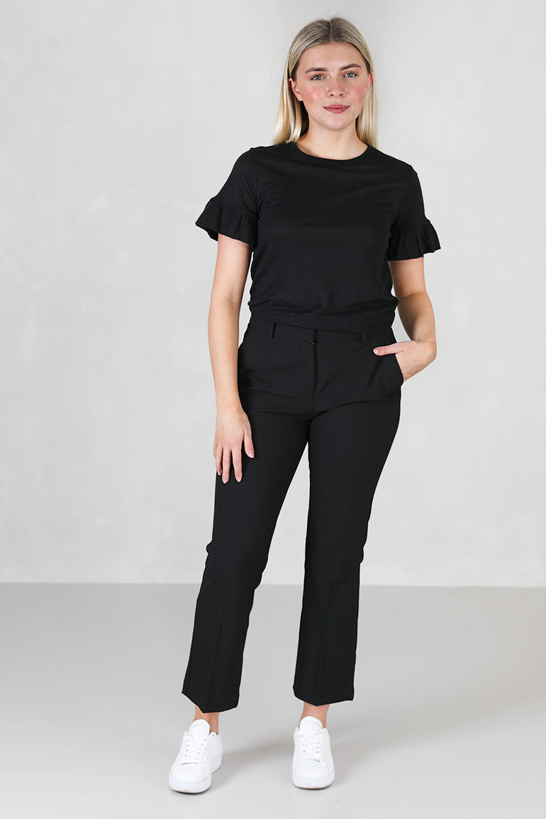 Lara tee fra norske Ella & il har blitt en av våre store favoritter. Den lille volangkanten gjør denne t-shirten til den perfekte pen t-shirten som er like fin til hverdag som til fest. Den gjør litt ut av seg, men har likevel en klassisk og fin passform. Velg mellom hvit og sort.