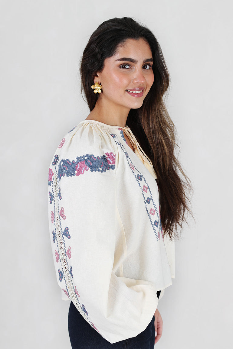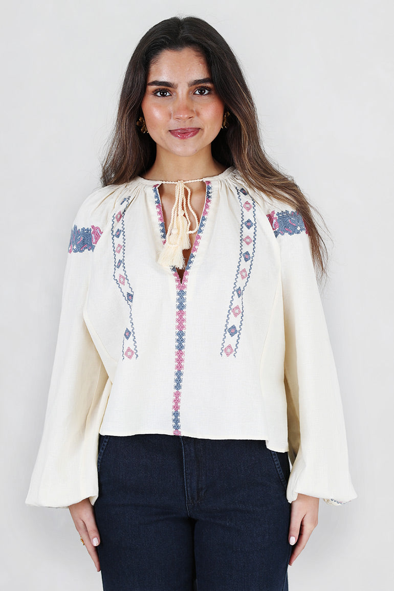 Helt nydelig bluse fra Pia Tjelta i offwhite bunn med deilig dusblått/rosa mønster. Lange ermer, v-hals med knyting i halsen. Strikk i ermene. Løs, litt kort modell.